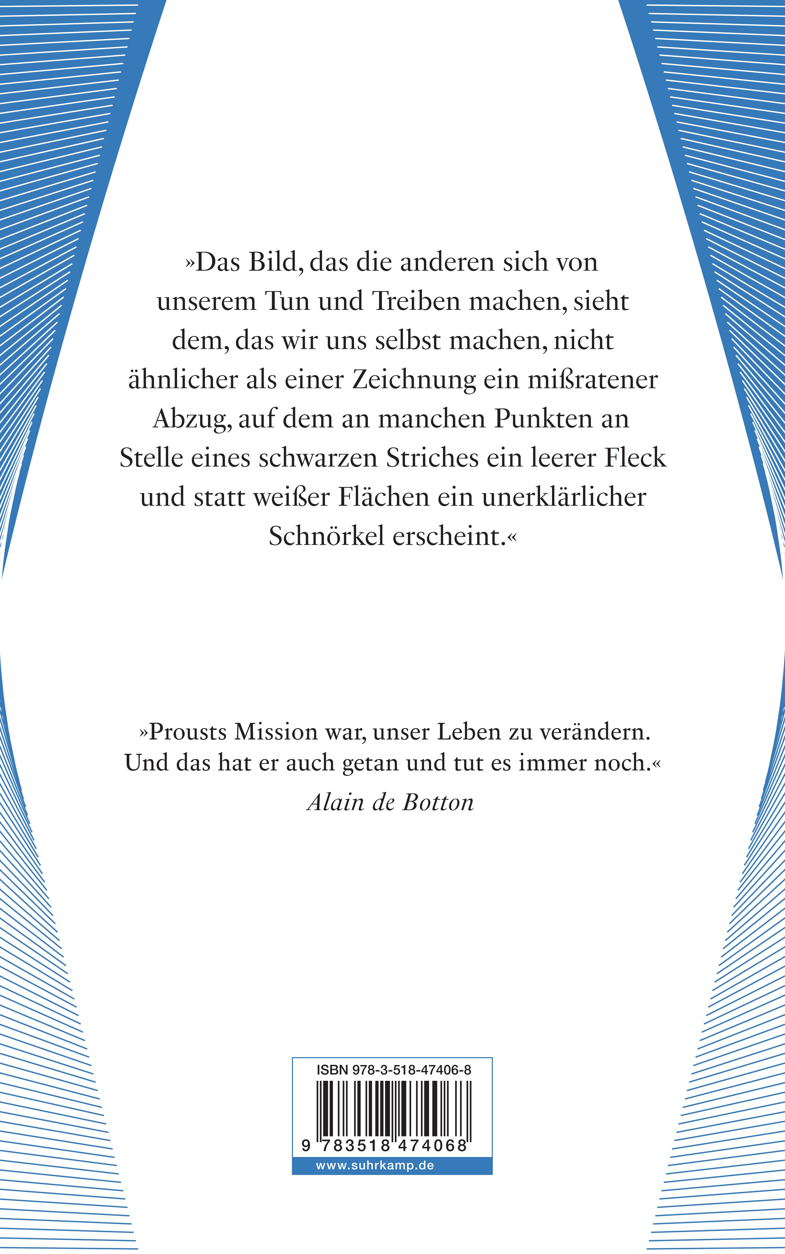 Marcel Proust wurde am 10. Juli 1871 in Auteuil geboren und starb am 18. November 1922 in Paris. Sein siebenbändiges Romanwerk Auf der Suche nach der verlorenen Zeit ist zu einem Mythos der Moderne geworden. Eine Asthmaerkrankung beeinträchtigte schon früh Prousts Gesundheit. Noch während des Studiums und einer kurzen Tätigkeit an der Bibliothek Mazarine widmete er sich seinen schriftstellerischen Arbeiten und einem – nur vermeintlich müßigen – Salonleben. Es erschienen Beiträge für Zeitschriften und die Übersetzungen zweier Bücher von John Ruskin. Nach dem Tod der über alles geliebten Mutter 1905, der ihn in eine tiefe Krise stürzte, machte Proust die Arbeit an seinem Roman zum einzigen Inhalt seiner Existenz. Sein hermetisch abgeschlossenes, mit Korkplatten ausgelegtes Arbeits- und Schlafzimmer ist legendär. In Swanns Welt, der erste Band von Prousts opus magnum, erschien 1913 auf Kosten des Autors im Verlag Grasset. Für den zweiten Band, Im Schatten junger Mädchenblüte, wurde Proust 1919 mit dem Prix Goncourt ausgezeichnet. Die letzten Bände der Suche nach der verlorenen Zeit wurden nach dem Tod des Autors von seinem Bruder herausgegeben.