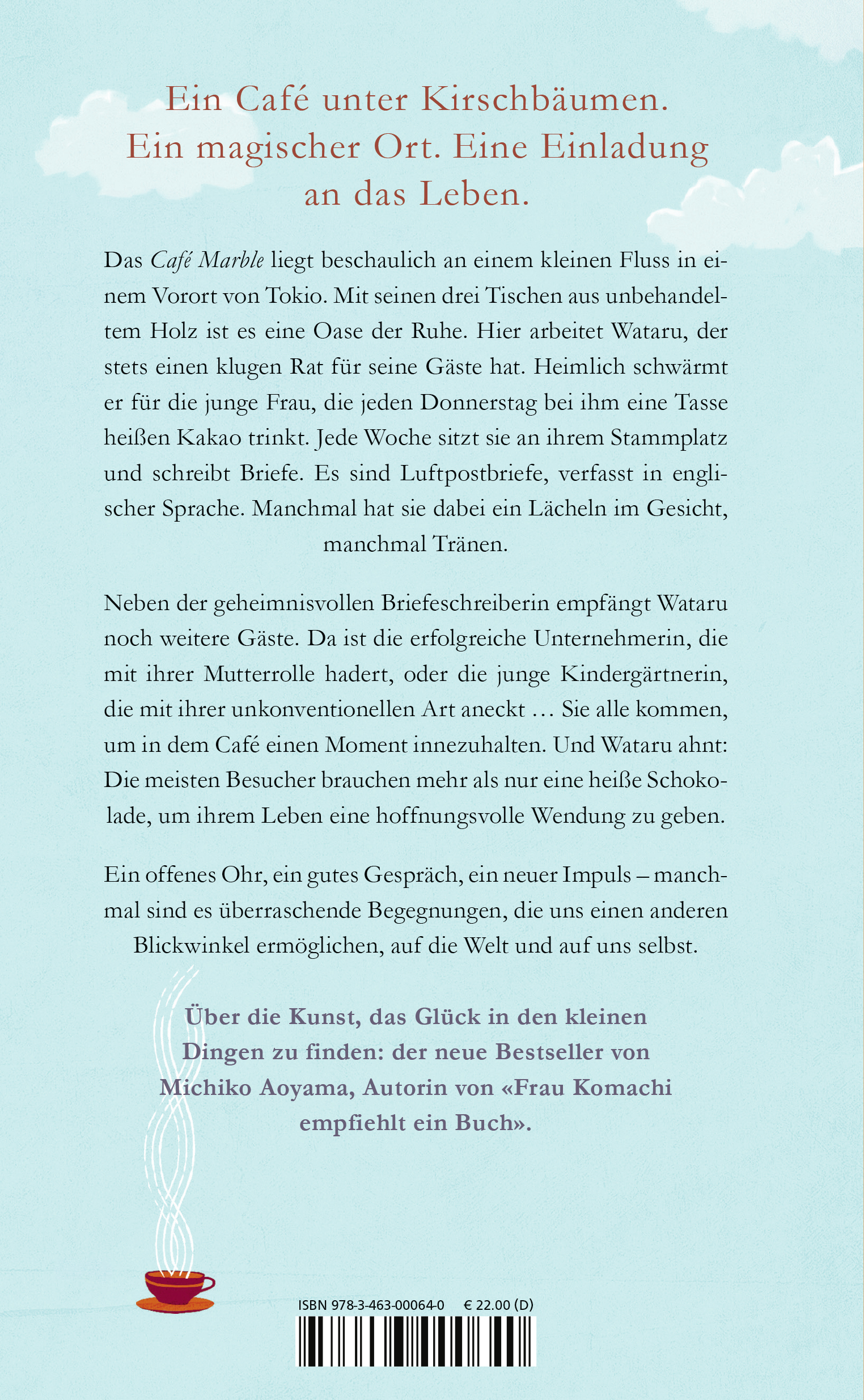 Das Café Marble liegt beschaulich an einem kleinen Fluss im Schatten der Kirschbäume in einem Vorort von Tokio. Mit seinen drei Tischen aus unbehandeltem Holz ist es eine Oase der Ruhe. Hier arbeitet der junge Wataru, der stets einen klugen Rat für seine Gäste hat. Heimlich schwärmt er für die junge Frau, die jeden Donnerstag bei ihm eine Tasse heißen Kakao trinkt. Jede Woche sitzt sie an ihrem Stammplatz und schreibt Briefe. Manchmal hat sie dabei ein Lächeln im Gesicht, manchmal eine Träne. Wataru würde gerne mehr von ihr erfahren. Er empfängt aber auch noch weitere Gäste. Sie alle kommen, um in dem Café einen Moment innezuhalten. Und die meisten Besucher brauchen mehr als nur eine heiße Schokolade, um ihrem Leben eine neue Wendung zu verleihen.