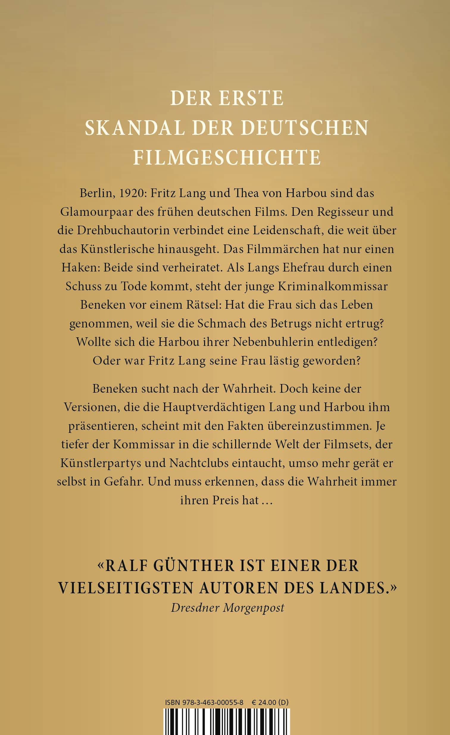 Berlin 1920: Fritz Lang und Thea von Harbou sind das Glamourpaar des frühen deutschen Films. Den Regisseur und die Drehbuchautorin verbindet eine Leidenschaft, die weit über das Künstlerische hinausgeht. Das Filmmärchen hat nur einen Haken: Beide sind verheiratet. Als Langs Ehefrau durch einen Schuss zu Tode kommt, steht der junge Kriminalkommissar Beneken vor einem Rätsel: Hat die Frau sich das Leben genommen, weil sie die Schmach des Betrugs nicht ertrug? Wollte sich die Harbou ihrer Nebenbuhlerin entledigen? Oder war Fritz Lang seine Frau lästig geworden?