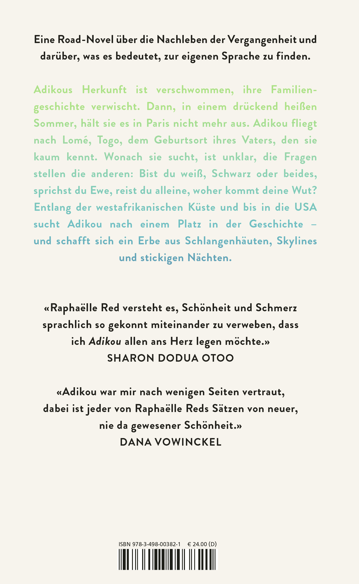 Eine Road-Novel über die Nachleben der Vergangenheit und darüber, was es bedeutet, zur eigenen Sprache zu finden: «Adikou war mir nach wenigen Seiten vertraut, als wäre sie schon immer da gewesen, dabei ist jeder von Raphaëlle Reds Sätzen von neuer, nie da gewesener Schönheit.» (Dana Vowinckel)