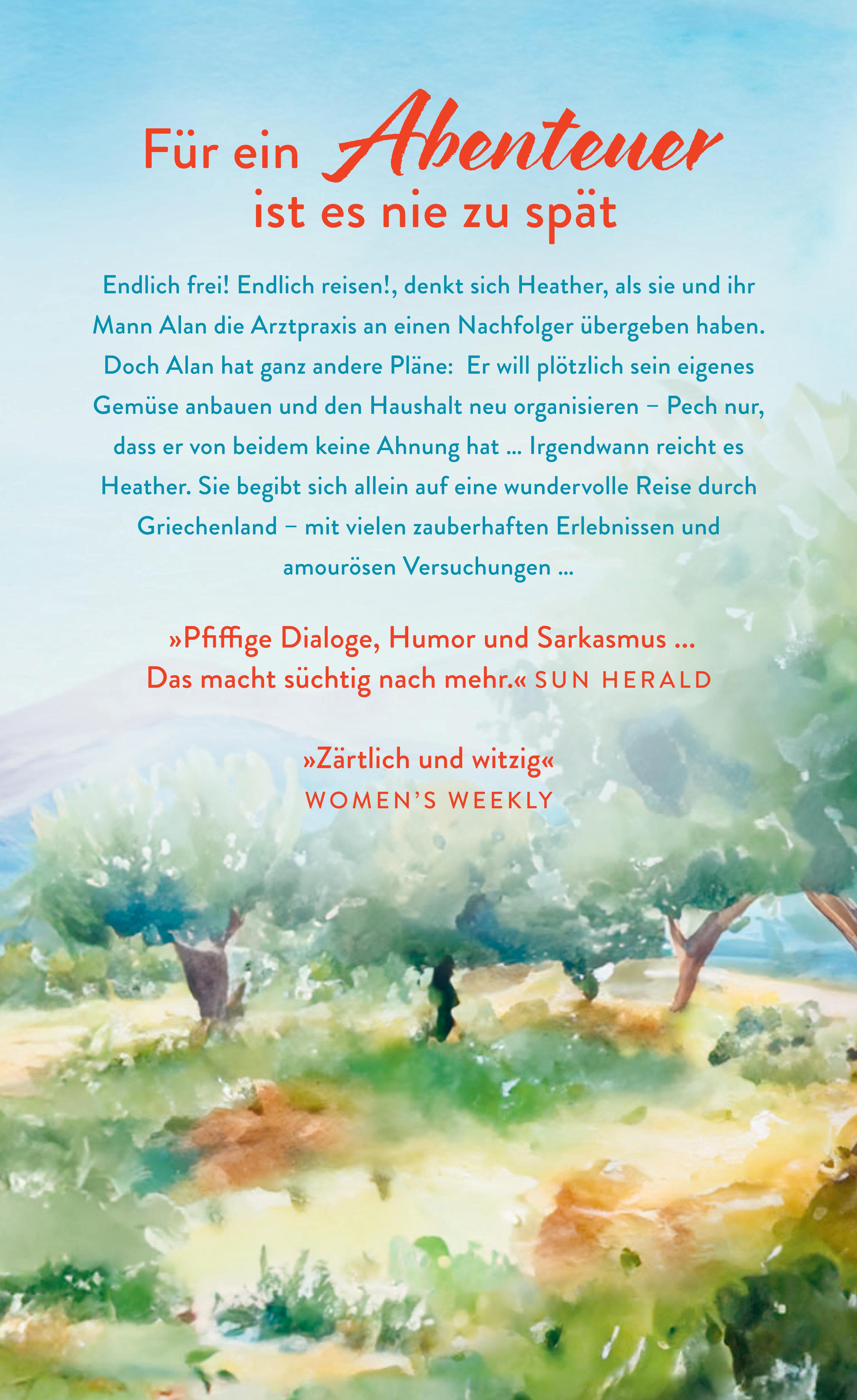 Endlich frei! Endlich reisen! Nun könnte dieser Traum wahr werden. Nach vierzig Jahren hängen Heather und ihr Mann Alan das Stethoskop an den Nagel und übergeben ihre Arztpraxis an einen Nachfolger. Schon lange hat Heather davon geträumt, die griechischen Inseln zu erkunden und aufregende Abenteuer zu erleben. Doch Reisen steht nicht auf Alans To-do-Liste. Er will sein eigenes Gemüse anbauen und den Haushalt neu organisieren - Pech nur, dass er von beidem so gar keine Ahnung hat ... Irgendwann reicht es Heather. Sie begibt sich allein auf ihre ganz eigene Odyssee durch Griechenland, mit vielen zauberhaften Erlebnissen und amourösen Versuchungen - bis Alan auftaucht, und beide erkennen, dass es für einen Neuanfang nie zu spät ist.