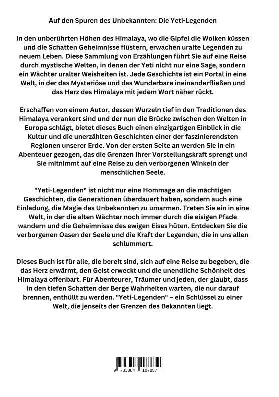 Auf den Spuren des Unbekannten: Die Yeti-LegendenIn den unberührten Höhen des Himalaya, wo die Gipfel die Wolken küssen und die Schatten Geheimnisse flüstern, erwachen uralte Legenden zu neuem Leben. Diese Sammlung von Erzählungen führt Sie auf eine Reise durch mystische Welten, in denen der Yeti nicht nur eine Sage, sondern ein Wächter uralter Weisheiten ist. Jede Geschichte ist ein Portal in eine Welt, in der das Mysteriöse und das Wunderbare ineinanderfließen und das Herz des Himalaya mit jedem Wort näher rückt.Erschaffen von einem Autor, dessen Wurzeln tief in den Traditionen des Himalaya verankert sind und der nun die Brücke zwischen den Welten in Europa schlägt, bietet dieses Buch einen einzigartigen Einblick in die Kultur und die unerzählten Geschichten einer der faszinierendsten Regionen unserer Erde. Von der ersten Seite an werden Sie in ein Abenteuer gezogen, das die Grenzen Ihrer Vorstellungskraft sprengt und Sie mitnimmt auf eine Reise zu den verborgenen Winkeln der menschlichen Seele."Yeti-Legenden" ist nicht nur eine Hommage an die mächtigen Geschichten, die Generationen überdauert haben, sondern auch eine Einladung, die Magie des Unbekannten zu umarmen. Treten Sie ein in eine Welt, in der die alten Wächter noch immer durch die eisigen Pfade wandern und die Geheimnisse des ewigen Eises hüten. Entdecken Sie die verborgenen Oasen der Seele und die Kraft der Legenden, die in uns allen schlummert.Dieses Buch ist für alle, die bereit sind, sich auf eine Reise zu begeben, die das Herz erwärmt, den Geist erweckt und die unendliche Schönheit des Himalaya offenbart. Für Abenteurer, Träumer und jeden, der glaubt, dass in den tiefen Schatten der Berge Wahrheiten warten, die nur darauf brennen, enthüllt zu werden. "Yeti-Legenden" - ein Schlüssel zu einer Welt, die jenseits der Grenzen des Bekannten liegt.