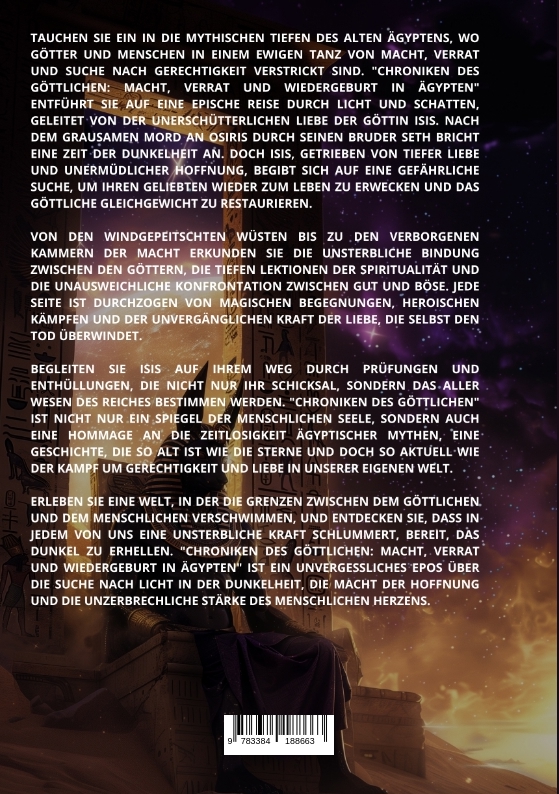 Tauchen Sie ein in die mythischen Tiefen des alten Ägyptens, wo Götter und Menschen in einem ewigen Tanz von Macht, Verrat und Suche nach Gerechtigkeit verstrickt sind. "Chroniken des Göttlichen: Macht, Verrat und Wiedergeburt in Ägypten" entführt Sie auf eine epische Reise durch Licht und Schatten, geleitet von der unerschütterlichen Liebe der Göttin Isis. Nach dem grausamen Mord an Osiris durch seinen Bruder Seth bricht eine Zeit der Dunkelheit an. Doch Isis, getrieben von tiefer Liebe und unermüdlicher Hoffnung, begibt sich auf eine gefährliche Suche, um ihren Geliebten wieder zum Leben zu erwecken und das göttliche Gleichgewicht zu restaurieren.Von den windgepeitschten Wüsten bis zu den verborgenen Kammern der Macht erkunden Sie die unsterbliche Bindung zwischen den Göttern, die tiefen Lektionen der Spiritualität und die unausweichliche Konfrontation zwischen Gut und Böse. Jede Seite ist durchzogen von magischen Begegnungen, heroischen Kämpfen und der unvergänglichen Kraft der Liebe, die selbst den Tod überwindet.Begleiten Sie Isis auf ihrem Weg durch Prüfungen und Enthüllungen, die nicht nur ihr Schicksal, sondern das aller Wesen des Reiches bestimmen werden. "Chroniken des Göttlichen" ist nicht nur ein Spiegel der menschlichen Seele, sondern auch eine Hommage an die Zeitlosigkeit ägyptischer Mythen, eine Geschichte, die so alt ist wie die Sterne und doch so aktuell wie der Kampf um Gerechtigkeit und Liebe in unserer eigenen Welt.Erleben Sie eine Welt, in der die Grenzen zwischen dem Göttlichen und dem Menschlichen verschwimmen, und entdecken Sie, dass in jedem von uns eine unsterbliche Kraft schlummert, bereit, das Dunkel zu erhellen. "Chroniken des Göttlichen: Macht, Verrat und Wiedergeburt in Ägypten" ist ein unvergessliches Epos über die Suche nach Licht in der Dunkelheit, die Macht der Hoffnung und die unzerbrechliche Stärke des menschlichen Herzens.