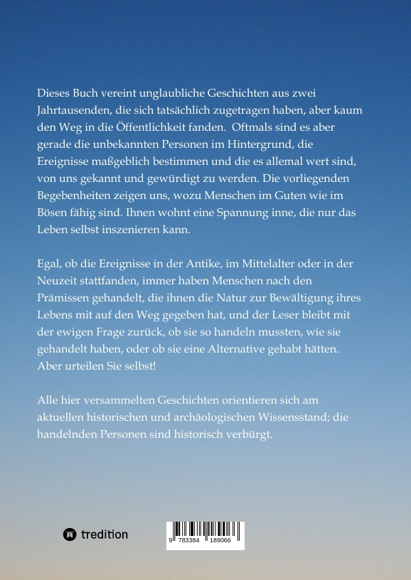 Dieses Buch vereint unglaubliche Geschichten aus zwei Jahrtausenden, die sich tatsächlich zugetragen haben, aber kaum den Weg in die Öffentlichkeit fanden. Sie sind von einer inneren Spannung geprägt, die nur das Leben selbst schreibt und die sich oft der kühnsten Phantasie des Schriftstellers entzieht. Sei es der unglaubliche Mut der indischen Agentin Noor-Inayat Khan im besetzten Paris der 1940er Jahre, der Mut des Hitler-Attentäters Georg Elser, der russischen Offiziere Petrow und Archipow, die einen Atomkrieg verhinderten, oder des Marschalls Tuchatschewski, der dem Verfolgungswahn Stalins zum Opfer fiel. Sei es die Kühnheit der aramäischen Königin Zenobia, die sich dem römischen Imperium in den Weg stellte, die Mathematikerin Hypatia aus dem antiken Alexandria, deren Verwegenheit ihren Märtyrertod zur Folge hatte, die Weisheit des Begründers der Demokratie Solon von Athen, oder die Vernunft der Politiker, die den russisch-amerikanischen Alaska-Vertrag verhandelten, alle Geschichten erzählen davon, wie Menschen in ihr eigenes Schicksal verstrickt sind und sich aus den Fallstricken des Lebens oftmals nicht befreien können.