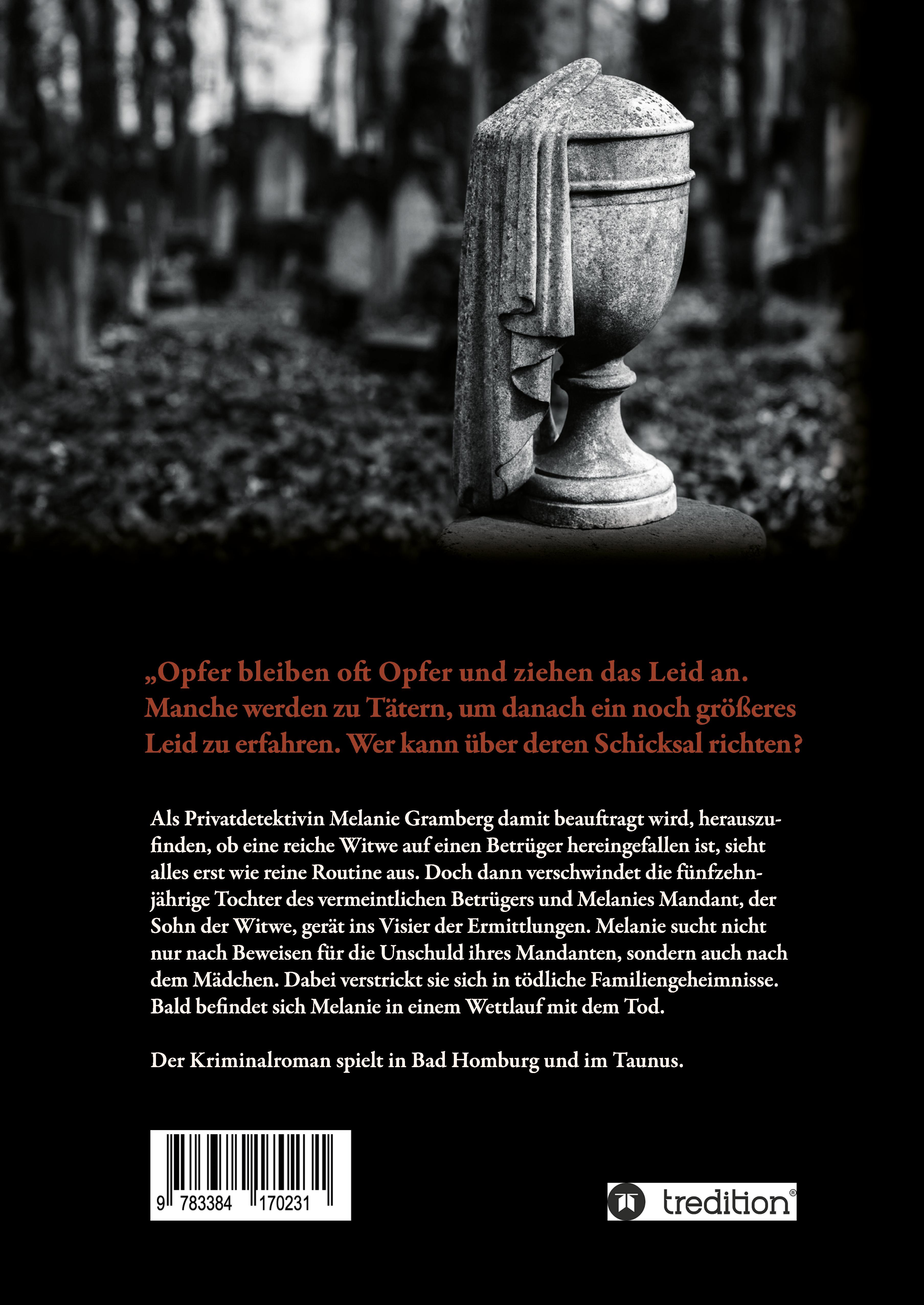 Opfer bleiben oft Opfer und ziehen das Leid an. Manche werden zu Tätern, um danach ein noch größeres Leid zu erfahren. Wer kann über deren Schicksal richten?Als Privatdetektivin Melanie Gramberg damit beauftragt wird, herauszufinden, ob eine reiche Witwe auf einen Betrüger hereingefallen ist, sieht alles erst wie reine Routine aus. Doch dann verschwindet die fünfzehnjährige Tochter des vermeintlichen Betrügers und Melanies Mandant, der Sohn der Witwe, gerät ins Visier der Ermittlungen. Melanie sucht nicht nur nach Beweisen für die Unschuld ihres Mandanten, sondern auch nach dem Mädchen. Dabei verstrickt sie sich in tödliche Familiengeheimnisse. Bald befindet sich Melanie in einem Wettlauf mit dem Tod. Der Kriminalroman spielt in Bad Homburg und im Taunus.
