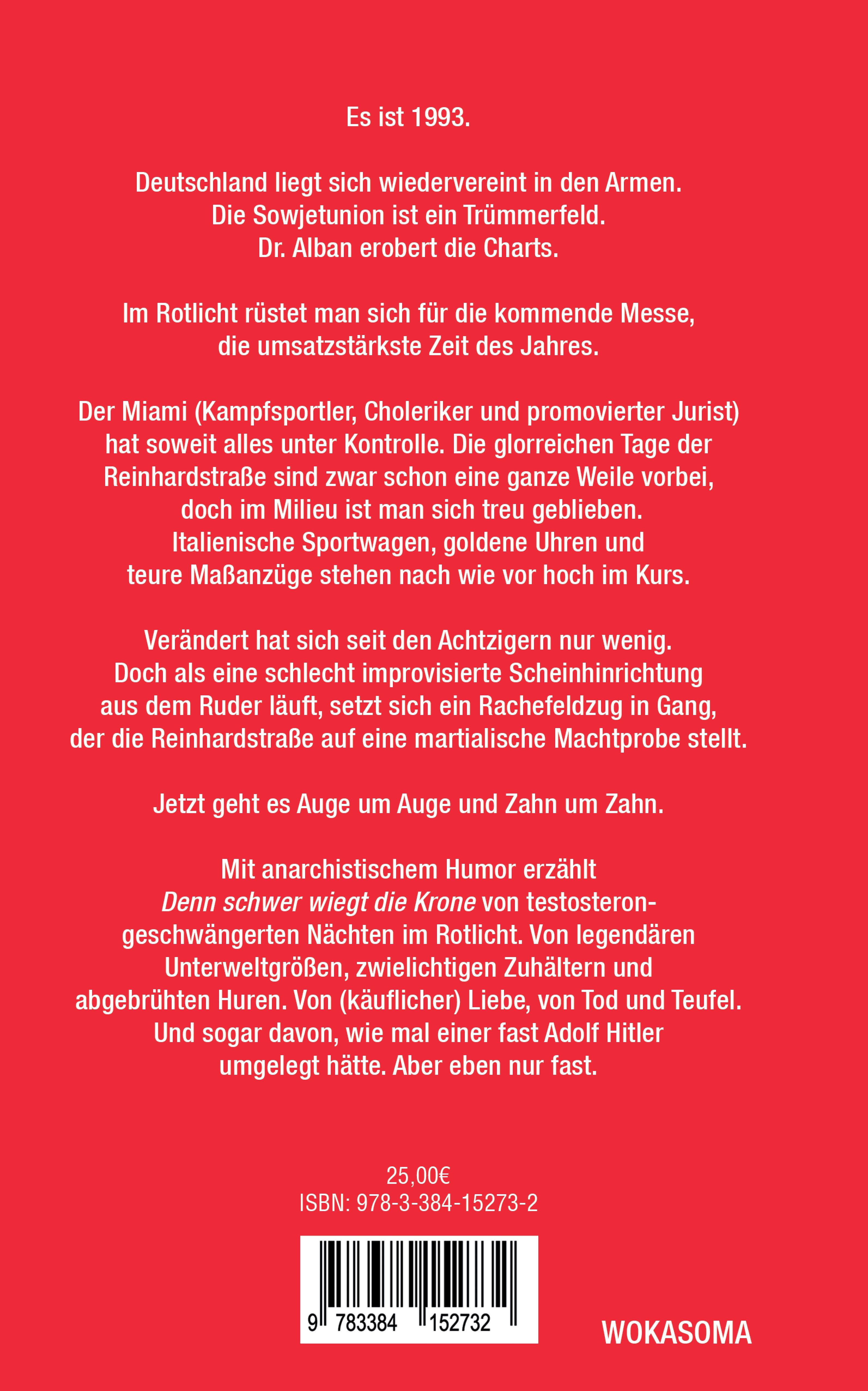 Es ist 1993. Deutschland liegt sich wiedervereint in den Armen. Die Sowjetunion ist ein Trümmerfeld. Dr. Alban erobert die Charts. Im Rotlicht rüstet man sich für die kommende Messe, die umsatzstärkste Zeit des Jahres. Der Miami (Kampfsportler, Choleriker und promovierter Jurist) hat soweit alles unter Kontrolle. Die glorreichen Tage der Reinhardstraße sind zwar schon eine ganze Weile vorbei, doch im Milieu ist man sich treu geblieben. Italienische Sportwagen, goldene Uhren und teure Maßanzüge stehen nach wie vor hoch im Kurs. Verändert hat sich seit den Achtzigern nur wenig. Doch als eine schlecht improvisierte Scheinhinrichtung aus dem Ruder läuft, setzt sich ein Rachefeldzug in Gang, der die Reinhardstraße auf eine martialische Machtprobe stellt. Jetzt geht es Auge um Auge und Zahn um Zahn. Mit anarchistischem Humor erzählt Denn schwer wiegt die Krone von testosteron-geschwängerten Nächten im Rotlicht. Von legendären Unterweltgrößen, zwielichtigen Zuhältern und abgebrühten Huren. Von (käuflicher) Liebe, von Tod und Teufel. Und sogar davon, wie mal einer fast Adolf Hitler umgelegt hätte. Aber eben nur fast.