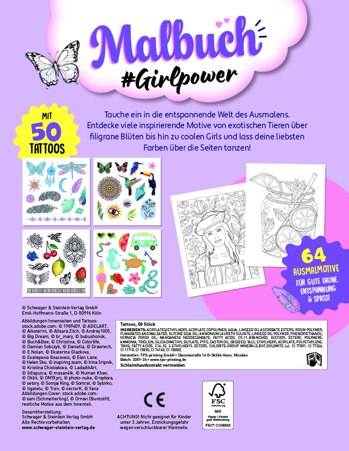 | Schlagworte | Ausmalen • Buch kreativ sein • Buch mit Tattoos • Buch Trend Kinder • cooles Geschenk Kinder • empowernd • Entspannung • für Frauen • für Jugendliche • für Mädchen • Für Teens • geschenk unter 10 euro • Girlpower • kindersichere Tattoos • Malbuch Auszeit • Malbuch für junge Erwachsene • Malbuch für Mädchen ab 10 Jahren • Malen • Schwager & Steinlein Verlag • stress reduzieren • Tattoobuch • Tattoos • Zum Entspannen |