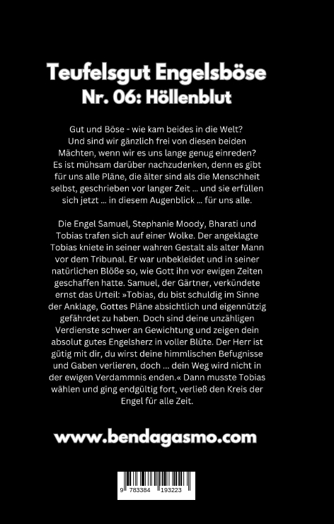 Gut und Böse - wie kam beides in die Welt? Und sind wir gänzlich frei von diesen beiden Mächten, wenn wir es uns lange genug einreden?Es ist mühsam darüber nachzudenken, denn es gibt für uns alle Pläne, die älter sind als die Menschheit selbst, geschrieben vor langer Zeit ... und sie erfüllen sich jetzt ... in diesem Augenblick ... für uns alle.Die Engel Samuel, Stephanie Moody, Bharati und Tobias trafen sich auf einer Wolke und entsprachen somit wenigstens einem Klischee, das unzählige Menschen von ihnen hatten. Der angeklagte Tobias kniete in seiner wahren Gestalt als alter Mann vor dem Tribunal. Er war unbekleidet und in seiner natürlichen Blöße so, wie Gott ihn vor ewigen Zeiten geschaffen hatte. Samuel, der Gärtner, verkündete ernst das Urteil: »Tobias, du bist schuldig im Sinne der Anklage, Gottes Pläne absichtlich und eigennützig gefährdet zu haben. Doch sind deine unzähligen Verdienste schwer an Gewichtung und zeigen dein absolut gutes Engelsherz in voller Blüte. Der Herr ist gütig mit dir, du wirst deine himmlischen Befugnisse und Gaben verlieren, doch ... dein Weg wird nicht in der ewigen Verdammnis enden.« Dann musste Tobias wählen und ging endgültig fort, verließ den Kreis der Engel für alle Zeit."Teufelsgut Engelsböse" - eine abgeschlossene 25-teilige Mystery-Serie für Erwachsene von Sabine & Thomas Benda