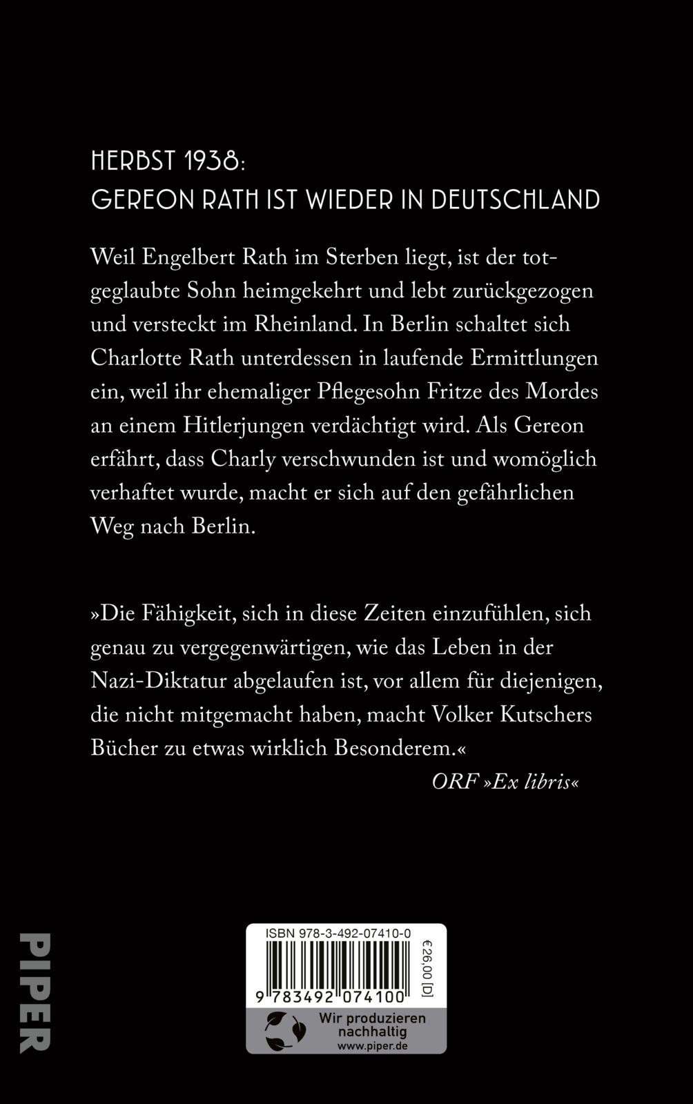 Damit ist beiden klar: Ein Leben in Deutschland ist so nicht mehr möglich, Widerstand ist geboten. Haben sie eine gemeinsame Zukunft und wo würde die liegen? Mit gewohnt hoher Spannung, historischer Tiefenschärfe und psychologischer Figurenzeichnung bringt Volker Kutscher seine Erfolgsserie zu einem erschütternden Abschluss.