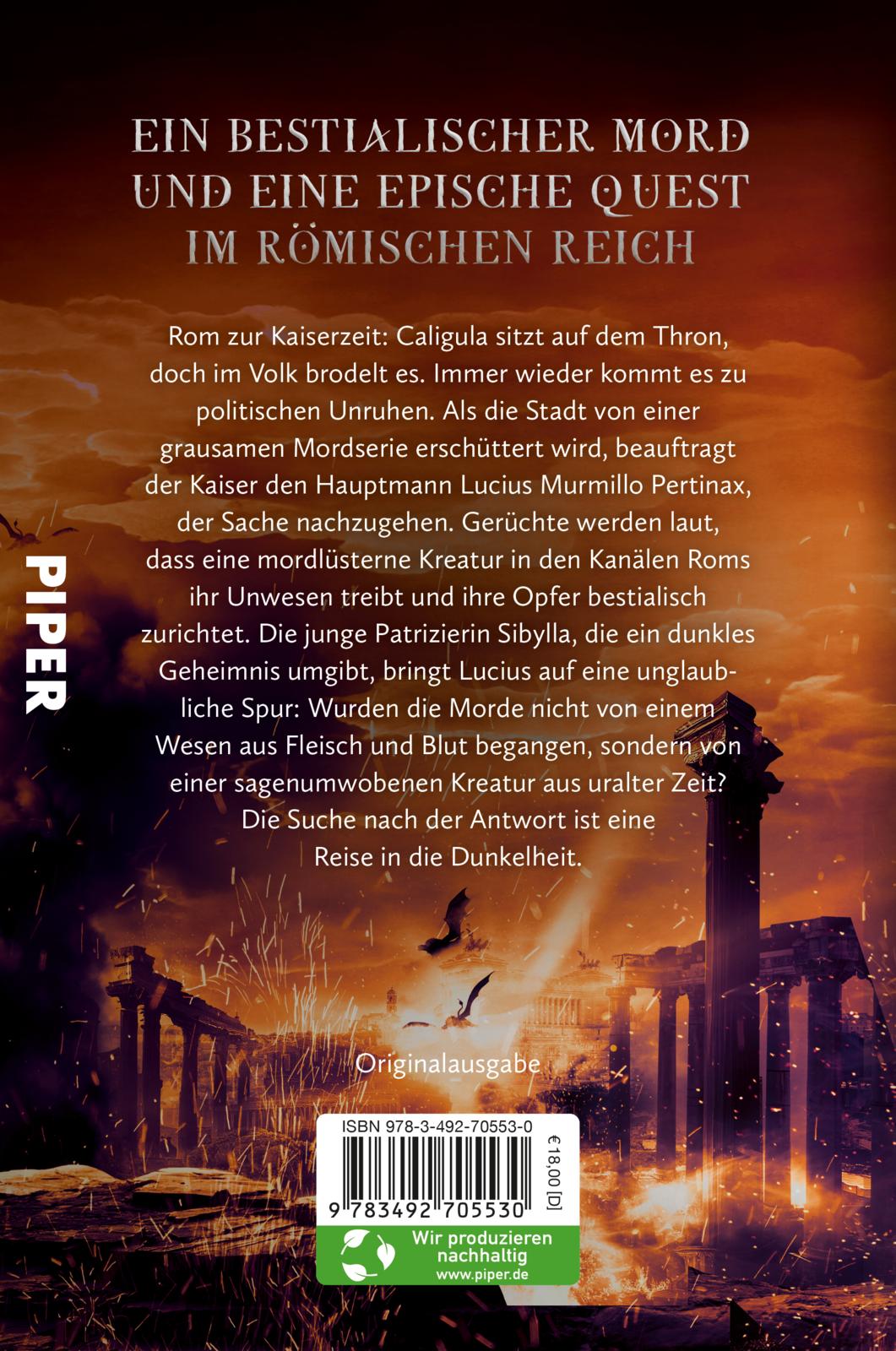 Rom zur Kaiserzeit: Caligula sitzt auf dem Thron, doch im Volk brodelt es. Immer wieder kommt es zu politischen Unruhen. Als die Stadt von einer grausamen Mordserie erschüttert wird, beauftragt der Kaiser den Hauptmann Lucius Murmillo Pertinax, der Sache nachzugehen. Gerüchte werden laut, dass eine mordlüsterne Kreatur in den Kanälen Roms ihr Unwesen treibt und ihre Opfer bestialisch zurichtet. Die junge Patrizierin Sibylla, die ein dunkles Geheimnis umgibt, bringt Lucius auf eine unglaubliche Spur: Wurden die Morde nicht von einem Wesen aus Fleisch und Blut begangen, sondern von einer sagenumwobenen Kreatur aus uralter Zeit? Die Suche nach der Antwort ist eine Reise in die Dunkelheit.