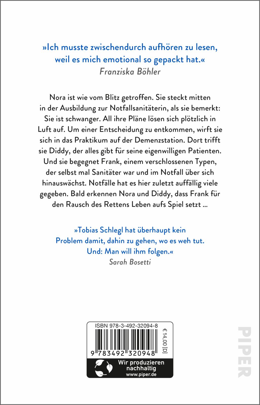 Nora ist wie vom Blitz getroffen. Sie steckt mitten in der Ausbildung zur Notfallsanitäterin, als sie bemerkt: Sie ist schwanger. All ihre Pläne lösen sich plötzlich in Luft auf. Um einer Entscheidung zu entkommen, wirft sie sich in das Praktikum auf der Demenzstation. Dort trifft sie Diddy, der alles gibt für seine eigenwilligen Patienten. Und sie begegnet Frank, einem verschlossenen Typen, der selbst mal Sanitäter war und im Notfall über sich hinauswächst. Notfälle hat es hier zuletzt auffällig viele gegeben. Bald erkennen Nora und Diddy, dass Frank für den Rausch des Rettens Leben aufs Spiel setzt ...