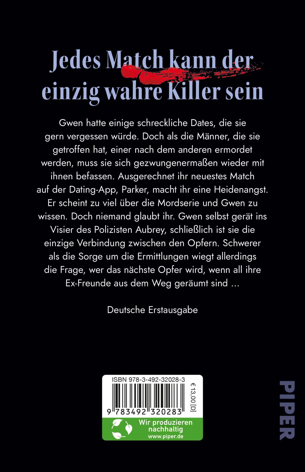 Gwen hatte einige schreckliche Dates, die sie gern vergessen würde. Doch sie muss sich wieder mit ihnen befassen, als die Männer einer nach dem anderen ermordet werden. Ausgerechnet ihr neuestes Match auf der App, Parker, macht ihr eine Heidenangst. Er scheint zu viel über die Mordserie und Gwen zu wissen. Doch niemand glaubt ihr. Gwen selbst gerät ins Visier des Polizisten Aubrey, schließlich ist sie die einzige Verbindung zwischen den Opfern. Schwerer als die Sorge um die Ermittlungen wiegt allerdings die Frage, wer das nächstes Opfer wird, wenn all ihre Ex-Freunde aus dem Weg geräumt sind ...