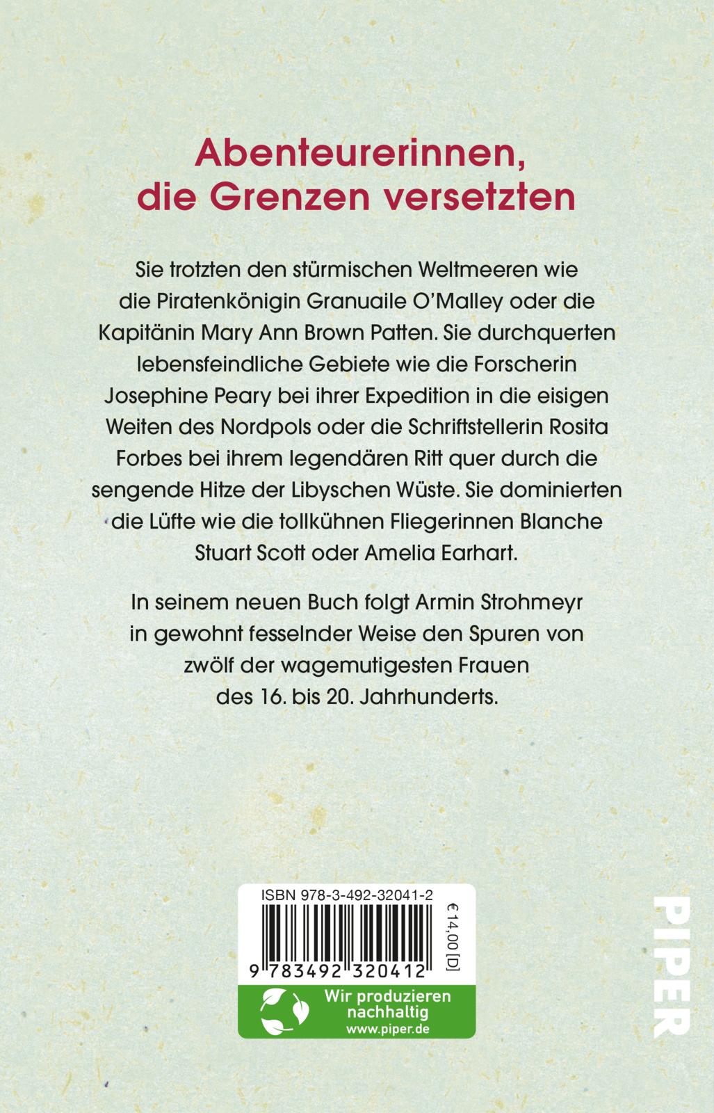 In seinem neuen Buch nimmt uns Armin Strohmeyr mit auf die tollkühnen Wagnisse von zwölf der mutigsten Abenteurerinnen des 16. bis 20. Jahrhunderts. Er führt uns hinaus aufs offene Meer, u. a. mit der Piratenkönigin Granuaile O'Malley, lässt uns mit Rosita Forbes die todbringende Libysche Wüste auf der Suche nach der verbotenen Oase Kufra durchreiten und entführt uns in die Weiten der Lüfte mit der Fliegerpionierin Amelia Earhart. Alle porträtierten furchtlosen Frauen einte der Drang, die Grenzen des Denkbaren zu weiten und sich die Welt gegen alle Widerstände zu eigen zu machen.