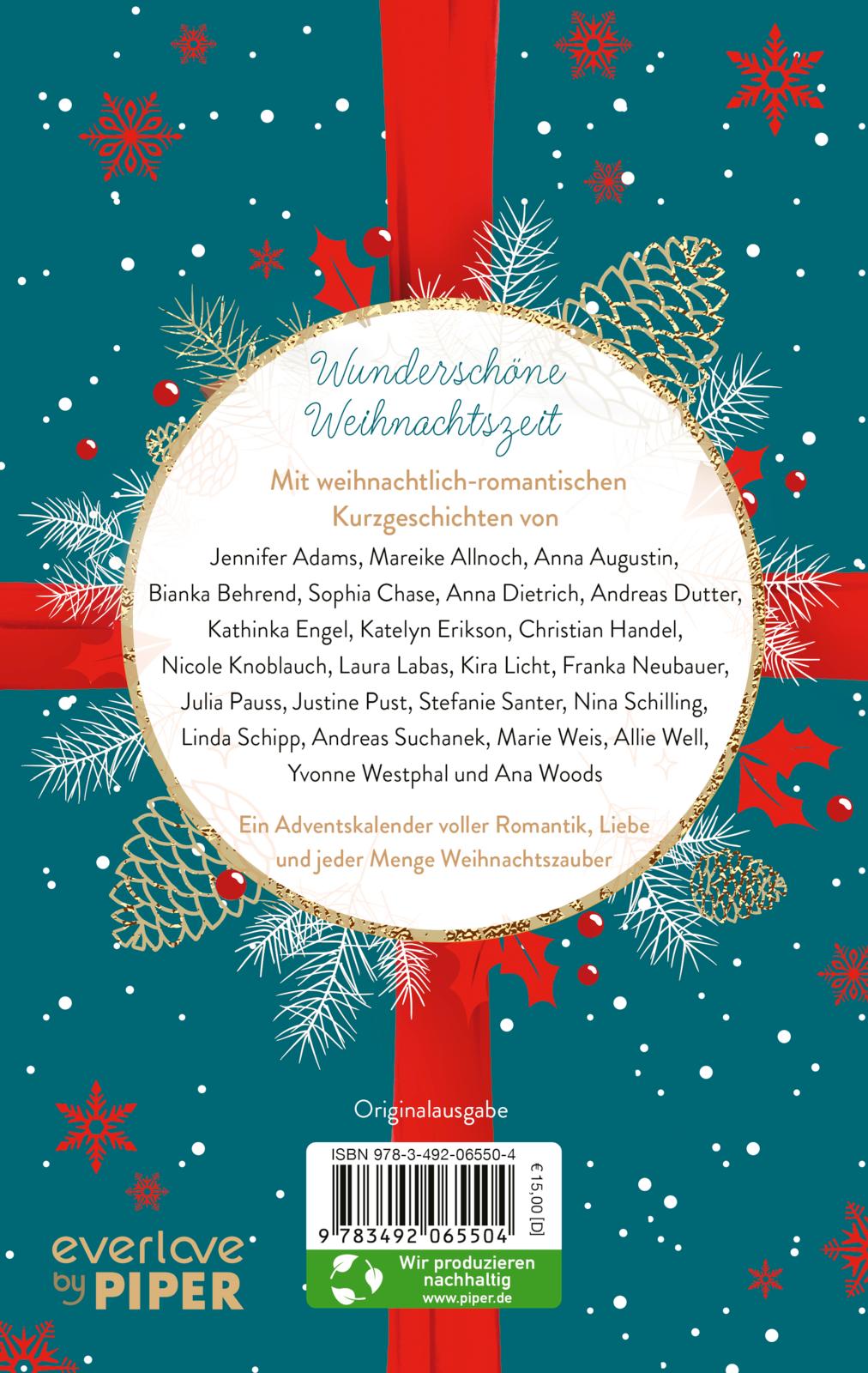 Ein Adventskalender mit Geschichten von Jennifer Adams, Mareike Allnoch, Anna Augustin, Bianka Behrend, Sophia Chase, Anna Dietrich, Andreas Dutter, Kathinka Engel, Katelyn Erikson, Christian Handel, Nicole Knoblauch, Laura Labas, Kira Licht, Franka Neubauer, Julia Pauss, Justine Pust, Stefanie Santer, Nina Schilling, Linda Schipp, Andreas Suchanek, Marie Weis, Allie Well, Yvonne Westphal und Ana Woods