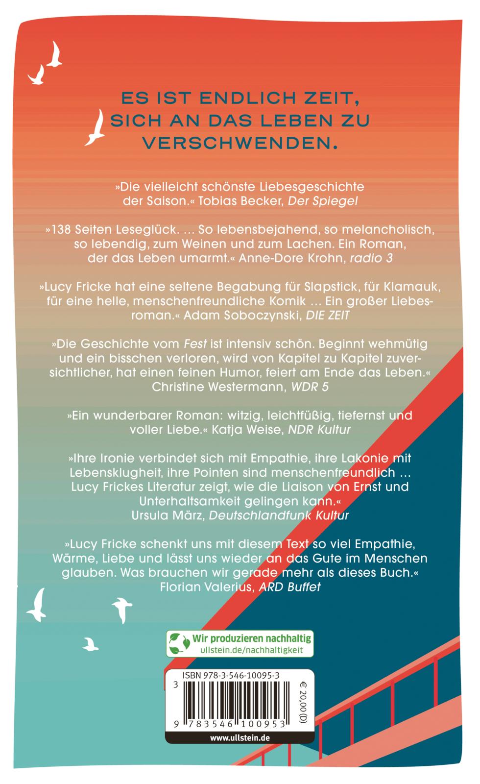 »Ihre Ironie verbindet sich mit Empathie, Ihre Lakonie mit Lebensklugheit, ihre Pointen sind menschenfreundlich. (...) Lucy Frickes Literatur zeigt, wie die Liaison von Ernst und Unterhaltsamkeit gelingen kann.« – Ursula März Deutschlandfunk Kultur Studio 9 20241107