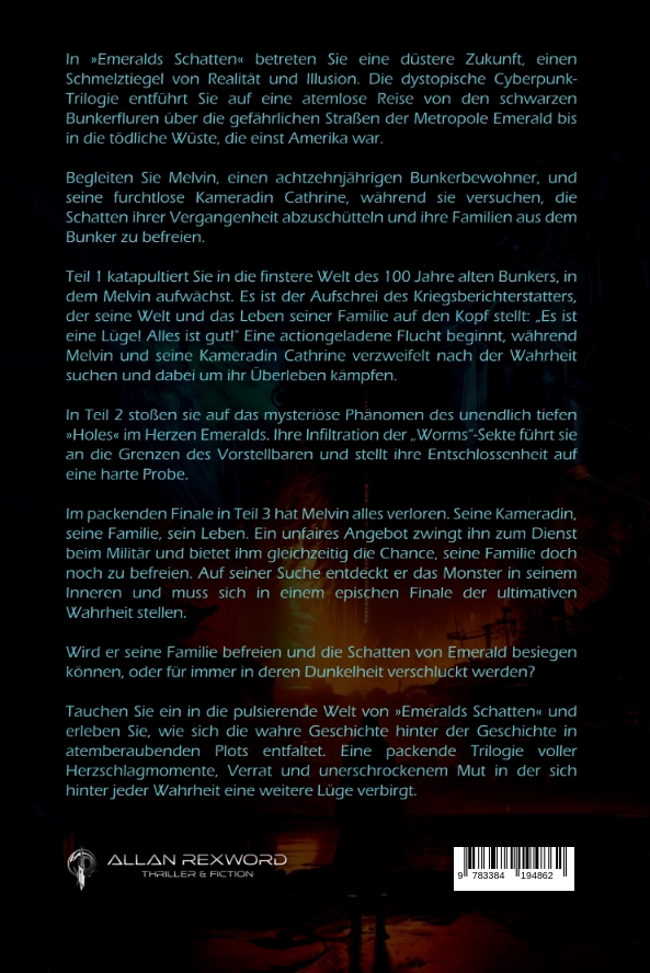 In »Emeralds Schatten« betreten Sie eine düstere Zukunft, einen Schmelztiegel von Realität und Illusion. Die dystopische Cyberpunk-Trilogie entführt Sie auf eine atemlose Reise von den schwarzen Bunkerfluren über die gefährlichen Straßen der Metropole Emerald bis in die tödliche Wüste, die einst Amerika war. Begleiten Sie Melvin, einen achtzehnjährigen Bunkerbewohner, und seine furchtlose Kameradin Cathrine, während sie versuchen, die Schatten ihrer Vergangenheit abzuschütteln und ihre Familien aus dem Bunker zu befreien.Teil 1 katapultiert Sie in die finstere Welt des 100 Jahre alten Bunkers, in dem Melvin aufwächst. Es ist der Aufschrei des Kriegsberichterstatters, der seine Welt und das Leben seiner Familie auf den Kopf stellt: "Es ist eine Lüge! Alles ist gut!" Eine actiongeladene Flucht beginnt, während Melvin und seine Kameradin Cathrine verzweifelt nach der Wahrheit suchen und dabei um ihr Überleben kämpfen. In Teil 2 stoßen sie auf das mysteriöse Phänomen des unendlich tiefen »Holes« im Herzen Emeralds. Ihre Infiltration der "Worms"-Sekte führt sie an die Grenzen des Vorstellbaren und stellt ihre Entschlossenheit auf eine harte Probe.Im packenden Finale in Teil 3 hat Melvin alles verloren. Seine Kameradin, seine Familie, sein Leben. Ein unfaires Angebot zwingt ihn zum Dienst beim Militär und bietet ihm gleichzeitig die Chance, seine Familie doch noch zu befreien. Auf seiner Suche entdeckt er das Monster in seinem Inneren und muss sich in einem epischen Finale der ultimativen Wahrheit stellen.Wird er seine Familie befreien und die Schatten von Emerald besiegen können, oder für immer in deren Dunkelheit verschluckt werden?Tauchen Sie ein in die pulsierende Welt von »Emeralds Schatten« und erleben Sie, wie sich die wahre Geschichte hinter der Geschichte in atemberaubenden Plots entfaltet. Eine packende Trilogie voller Herzschlagmomente, Verrat und unerschrockenem Mut in der sich hinter jeder Wahrheit eine weitere Lüge verbirgt.