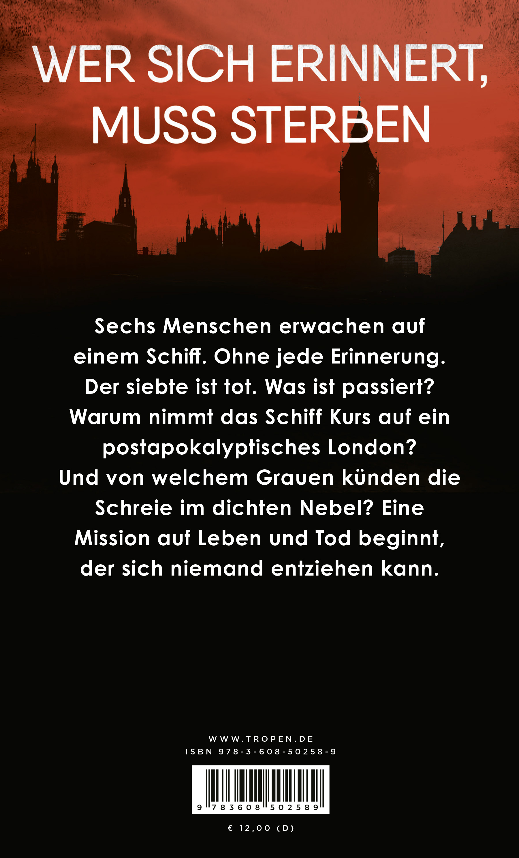 Sechs Menschen erwachen auf einem Schiff. Ohne jede Erinnerung. Der siebte ist tot. Was ist passiert? Warum nimmt das Schiff Kurs auf ein postapokalyptisches London? Und von welchem Grauen künden die Schreie im dichten Nebel? Eine Mission auf Leben und Tod beginnt, der sich niemand entziehen kann.
