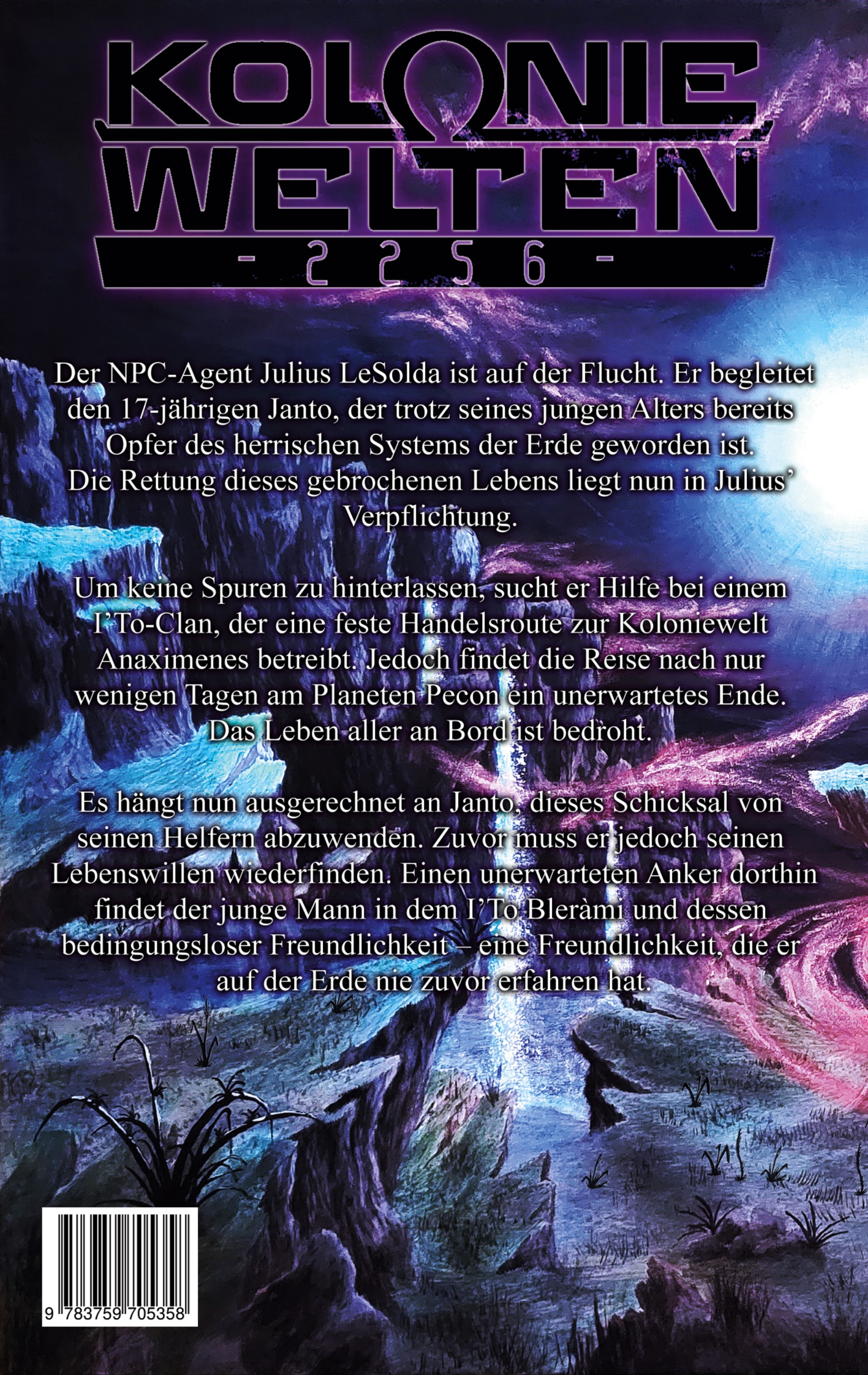Der NPC-Agent Julius LeSolda ist auf der Flucht. Er begleitet den 17-jährigen Janto, der trotz seines jungen Alters bereits Opfer des herrischen Systems der Erde geworden ist.Die Rettung dieses gebrochenen Lebens liegt nun in Julius' Verpflichtung.Um keine Spuren zu hinterlassen, sucht er Hilfe bei einem I'To-Clan, der eine feste Handelsroute zur Koloniewelt Anaximenes betreibt. Jedoch findet die Reise nach nur wenigen Tagen am Planeten Pecon ein unerwartetes Ende. Das Leben aller an Bord ist bedroht. Es hängt nun ausgerechnet an Janto, dieses Schicksal von seinen Helfern abzuwenden. Zuvor muss er jedoch seinen Lebenswillen wiederfinden. Einen unerwarteten Anker dorthin findet der junge Mann in dem I'To Bleràmi und dessen bedingungsloser Freundlichkeit - eine Freundlichkeit, die er auf der Erde nie zuvor erfahren hat.