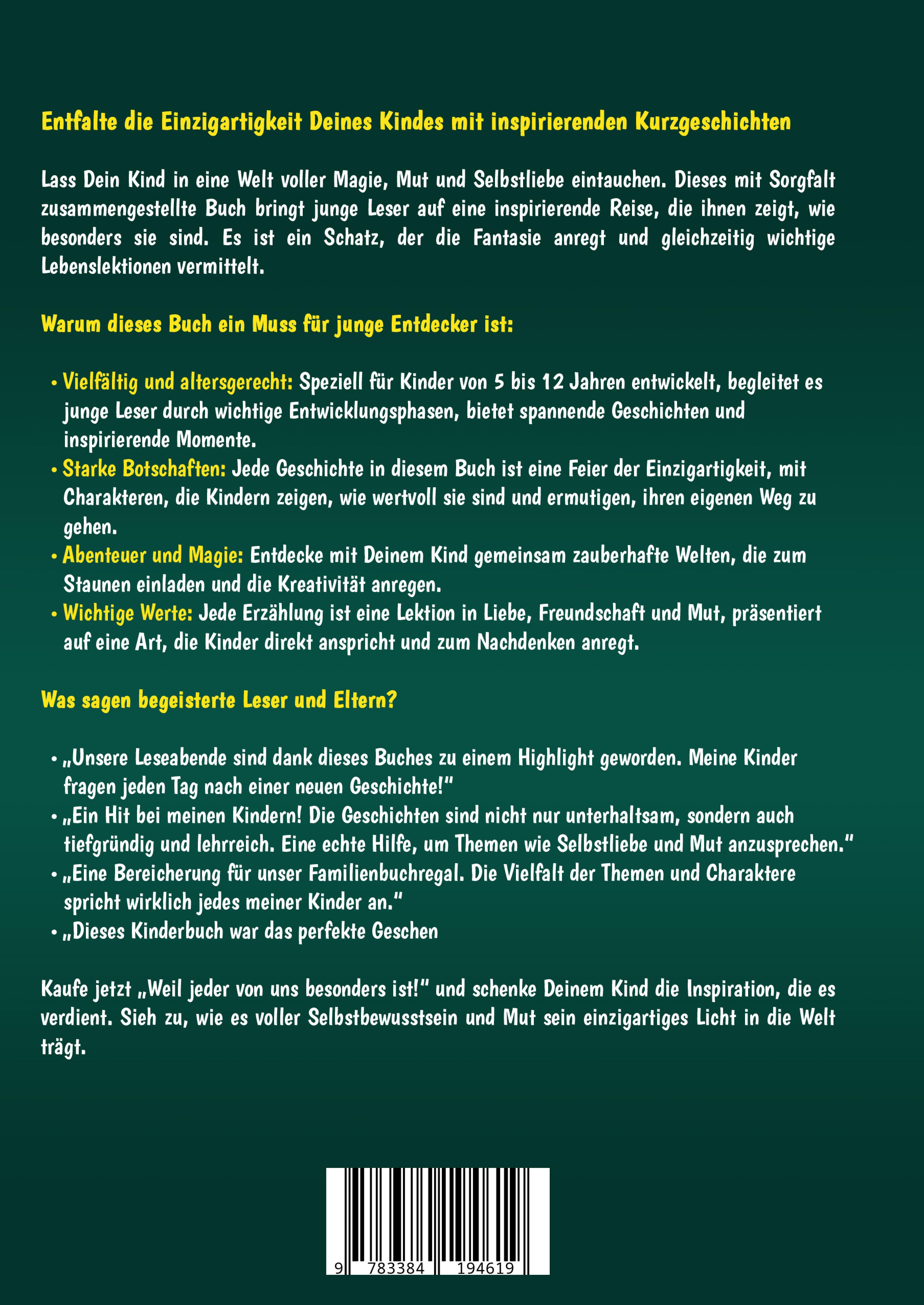 Entfalte die Einzigartigkeit Deines Kindes mit inspirierenden KurzgeschichtenLass Dein Kind in eine Welt voller Magie, Mut und Selbstliebe eintauchen. Dieses mit Sorgfalt zusammengestellte Buch bringt junge Leser auf eine inspirierende Reise, die ihnen zeigt, wie besonders sie sind. Es ist ein Schatz, der die Fantasie anregt und gleichzeitig wichtige Lebenslektionen vermittelt.Warum dieses Buch ein Muss für junge Entdecker ist:- Vielfältig und altersgerecht: Speziell für Kinder von 5 bis 12 Jahren entwickelt, begleitet es junge Leser durch wichtige Entwicklungsphasen, bietet spannende Geschichten und inspirierende Momente.- Starke Botschaften: Jede Geschichte in diesem Buch ist eine Feier der Einzigartigkeit, mit Charakteren, die Kindern zeigen, wie wertvoll sie sind und ermutigen, ihren eigenen Weg zu gehen.- Abenteuer und Magie: Entdecke mit Deinem Kind gemeinsam zauberhafte Welten, die zum Staunen einladen und die Kreativität anregen.- Wichtige Werte: Jede Erzählung ist eine Lektion in Liebe, Freundschaft und Mut, präsentiert auf eine Art, die Kinder direkt anspricht und zum Nachdenken anregt.Was sagen begeisterte Leser und Eltern?- "Unsere Leseabende sind dank dieses Buches zu einem Highlight geworden. Meine Kinder fragen jeden Tag nach einer neuen Geschichte!"- "Ein Hit bei meinen Kindern! Die Geschichten sind nicht nur unterhaltsam, sondern auch tiefgründig und lehrreich. Eine echte Hilfe, um Themen wie Selbstliebe und Mut anzusprechen."- "Eine Bereicherung für unser Familienbuchregal. Die Vielfalt der Themen und Charaktere spricht wirklich jedes meiner Kinder an."- "Dieses Kinderbuch war das perfekte Geschenk. Es hat uns viele kostbare Momente des gemeinsamen Lesens und Lernens beschert."Kaufe jetzt "Weil jeder von uns besonders ist!" und schenke Deinem Kind die Inspiration, die es verdient. Sieh zu, wie es voller Selbstbewusstsein und Mut sein einzigartiges Licht in die Welt trägt.