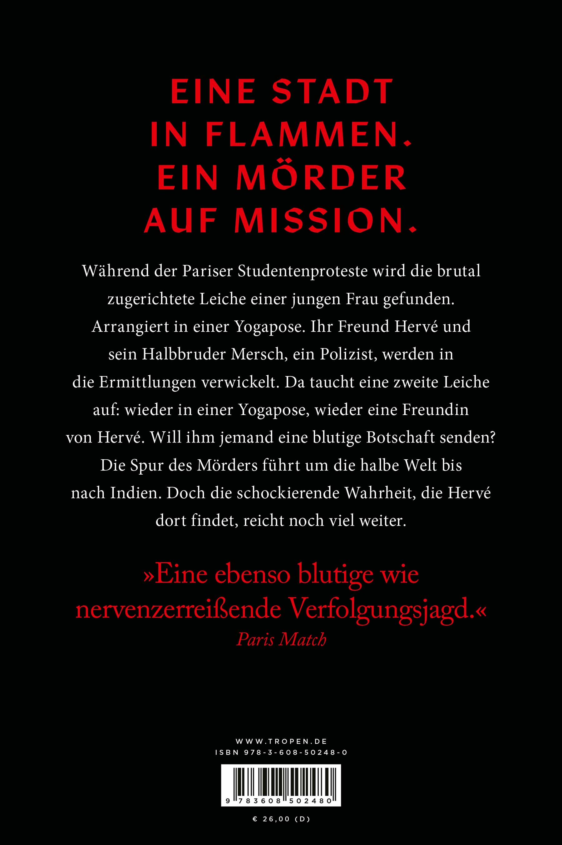 Während der Pariser Studentenproteste wird die brutal zugerichtete Leiche einer jungen Frau gefunden. Arrangiert in einer Yogapose. Ihr Freund Hervé und sein Halbbruder Mersch, ein Polizist, werden in die Ermittlungen verwickelt. Da taucht eine zweite Leiche auf: wieder in einer Yogapose, wieder eine Freundin von Hervé. Will ihm jemand eine blutige Botschaft senden? Die Spur des Mörders führt um die halbe Welt bis nach Indien. Doch die schockierende Wahrheit, die Hervé dort findet, reicht noch viel weiter.