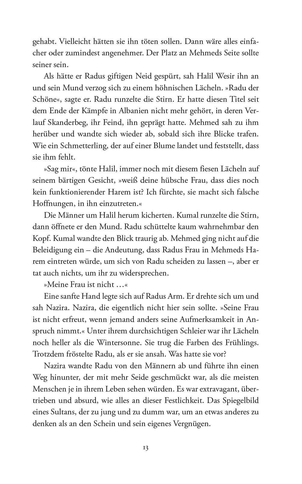 Lada senkte den Kopf und rieb sich den ständig verspannten Nacken. Seit ihrem misslungenen Versuch, den Thron zu besteigen, hatte sie weder an Mehmed noch an Radu geschrieben noch eine Nachricht von ihnen erhalten. Es war zu demütigend, ihr Scheitern vor ihnen zu offenbaren und zu ahnen, was sie sagen würden. Mehmed würde sie zur Rückkehr auffordern. Radu würde sie trösten – aber sie bezweifelte, dass er sie mit offenen Armen willkommen heißen würde. Sie fragte sich auch, wie nahe die beiden sich in ihrer Abwesenheit gekommen waren. Aber das war nicht wichtig. Sie hatte sich entschieden, sie als einen Akt der Stärke zu verlassen. Sie würde niemals aus Schwäche zu ihnen zurückkehren. Sie hatte geglaubt – mit ihren Männern, mit ihrer Befreiung von Mehmed, mit all ihren Jahren der Erfahrung und Stärke –, der Thron stünde ihr zu. Sie hatte geglaubt, sie wäre genug. Sie wusste jetzt, dass nichts, was sie tun konnte, jemals genug sein würde. Es sei denn, sie könnte sich einen Penis wachsen lassen, was unwahrscheinlich schien. Und auch nicht besonders wünschenswert. Allerdings wäre er dabei hilfreich, die Notdurft zu verrichten, wenn man sich ständig in den Wäldern versteckte. Mitten in der Nacht die Blase zu entleeren, war ein eiskaltes, unbequemes Unterfangen. Was blieb ihr dann noch? Sie hatte keine Verbündeten. Sie hatte keinen Thron. Sie hatte keinen Mehmed und keinen Radu. Sie hatte nur diese schlauen Männer, die scharfen Messer und die klaren Träume, und keine Möglichkeit, sie zu nutzen. Ihre Gesichter waren nicht mehr die nackten Visagen, die auf ihre Stellung als Janitscharen hingewiesen hatten. Sie waren frei. Aber sie waren auch orientierungslos, was Lada zunehmend beunruhigte. Wenn dreißig Männer, die zum Kämpfen und Töten ausgebildet waren, nichts hatten, wofür sie kämpfen und töten konnten, was sollte sie dann noch an sie binden? Sie zog einen Zweig aus dem Feuer. Er war ein brennendes Zeichen, das ihre Augen mit seinem Licht versengte. Sie spürte mehr, als dass sie es sah, wie sich die Aufmerksamkeit ihrer Männer auf sie richtete. Es fühlte sich nicht wie eine Last an, sondern ließ sie noch aufrechter stehen. Die Männer brauchten etwas zu tun. Und Lada musste etwas brennen sehen.