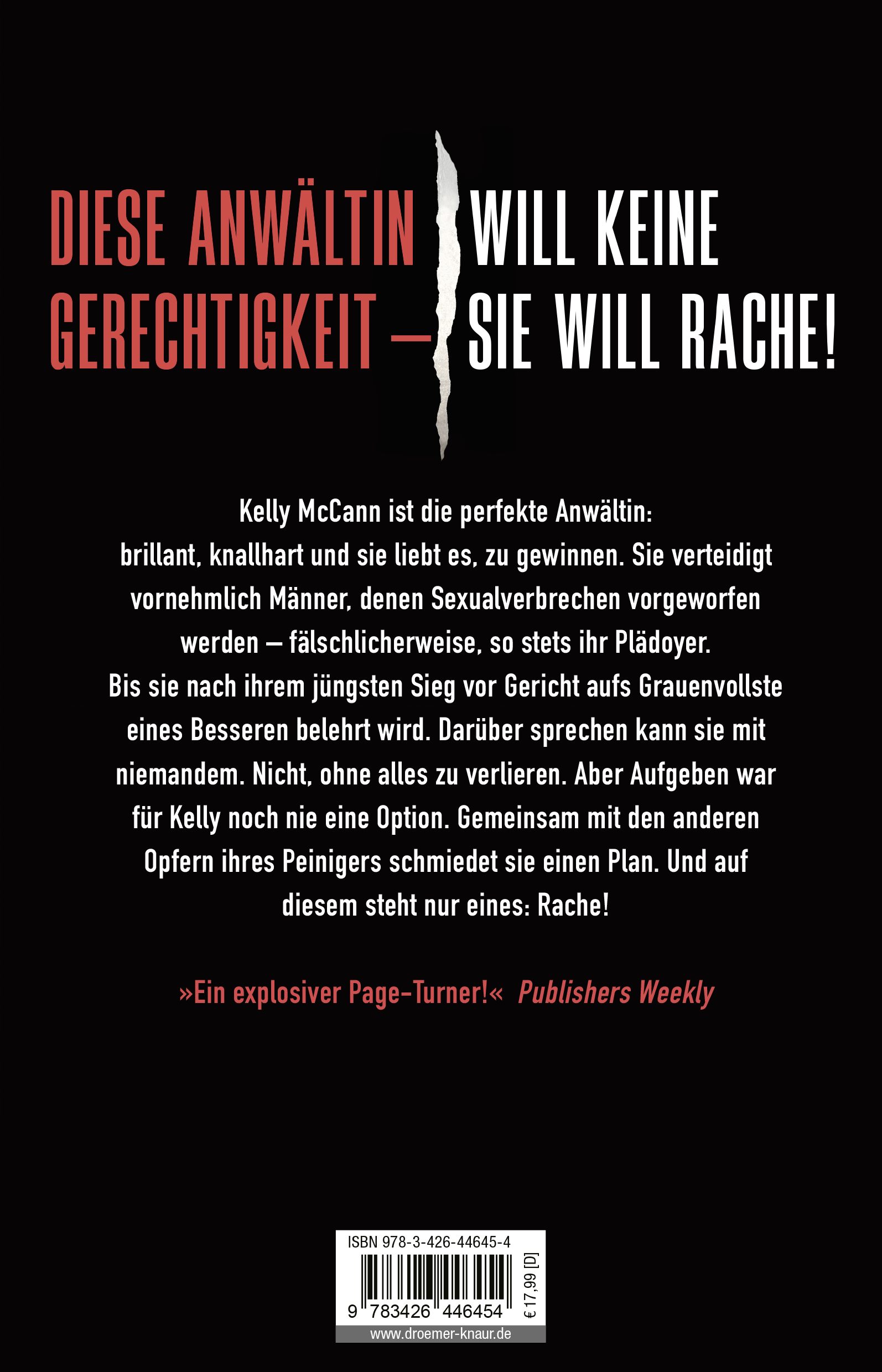 Kelly McCann ist brillant, knallhart und liebt es zu gewinnen. Sie ist die perfekte Anwältin. Ihr Spezialgebiet: die Verteidigung von Männern, denen Sexualverbrechen vorgeworfen werden - fälschlicherweise, so stets ihr Plädoyer. Bis sie, unmittelbar nach seinem Freispruch, die grauenvolle Wahrheit über einen ihrer Mandanten aus erster Hand erfahren muss. Darüber sprechen kann sie mit niemandem. Nicht, ohne alles zu verlieren. Aber ihren Peiniger deshalb ungestraft davonkommen zu lassen, ist für Kelly keine Option. Stattdessen verbündet sie sich mit seinen anderen Opfern und gemeinsam schmieden sie einen Plan. Und auf diesem steht nur eines: Rache! Doch irgendjemand, so scheint es, hat es auf die Frauen abgesehen ...
