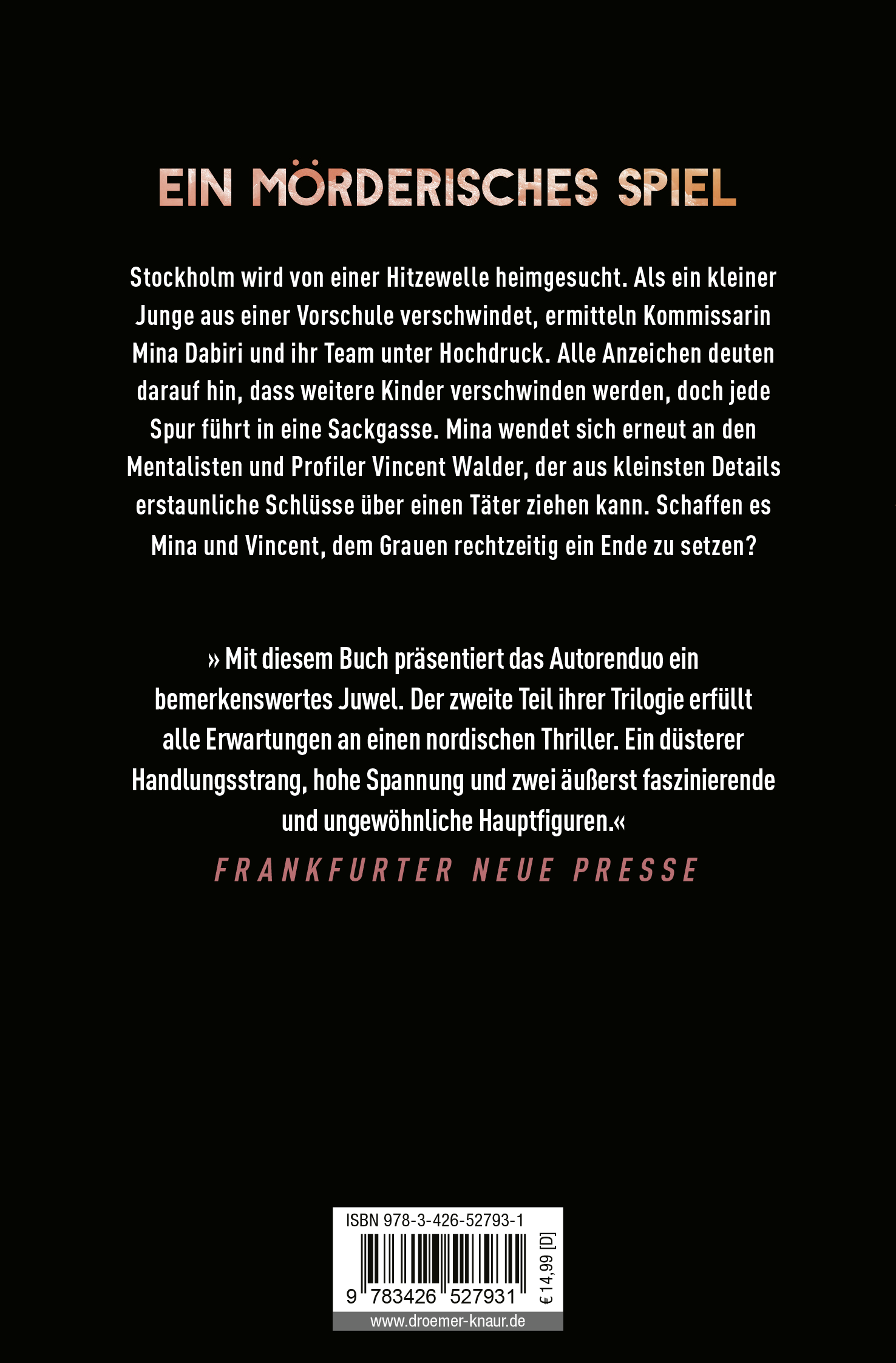 »Mit der 'Dabiri-Walder-Trilogie' haben Läckberg und Fexeus außergewöhnliche skandinavische Spannung geschaffen: Ein faszinierendes Ermittlerduo mit Ecken und Kanten trifft auf menschliche Abgründe, trickreiche Rätsel und Codes.«
