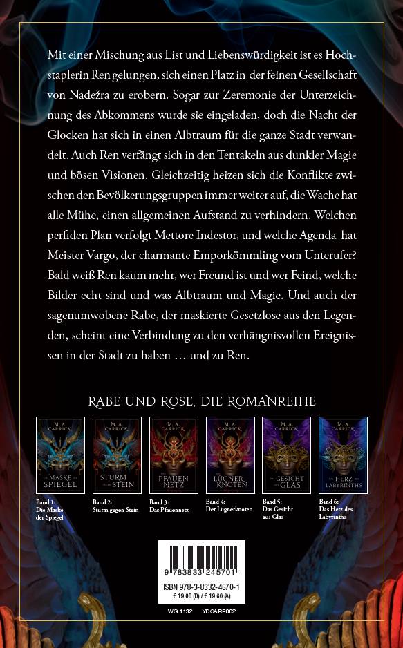 Mit einer Mischung aus List und Liebenswürdigkeit ist es Hochstaplerin Ren gelungen, sich einen Platz in der feinen Gesellschaft von Nadezra zu erobern. Sogar zur Zeremonie der Unterzeichnung des Abkommens wurde sie eingeladen, doch die Nacht der Glocken hat sich in einen Albtraum für die ganze Stadt verwandelt. Auch Ren verfängt sich in den Tentakeln aus dunkler Magie und bösen Visionen. Gleichzeitig heizen sich die Konflikte zwischen den Bevölkerungsgruppen immer weiter auf, die Wache hat alle Mühe, einen allgemeinen Aufstand zu verhindern. Welchen perfiden Plan verfolgt Mettore Indestor, und welche Agenda hat Meister Vargo, der charmante Emporkömmling vom Unterufer? Bald weiß Ren kaum mehr, wer Freund ist und wer Feind, welche Bilder echt sind und was Albtraum und Magie. Und auch der sagenumwobene Rabe, der maskierte Gesetzlose aus den Legenden, scheint eine Verbindung zu den verhängnisvollen Ereignissen in der Stadt zu haben ... und zu Ren. Rabe und Rose, die Romanreihe: Band 1: Die Maske der Spiegel Band 2: Sturm gegen Stein Band 3: Das PfauennetzBand 4: Der Lügnerknoten