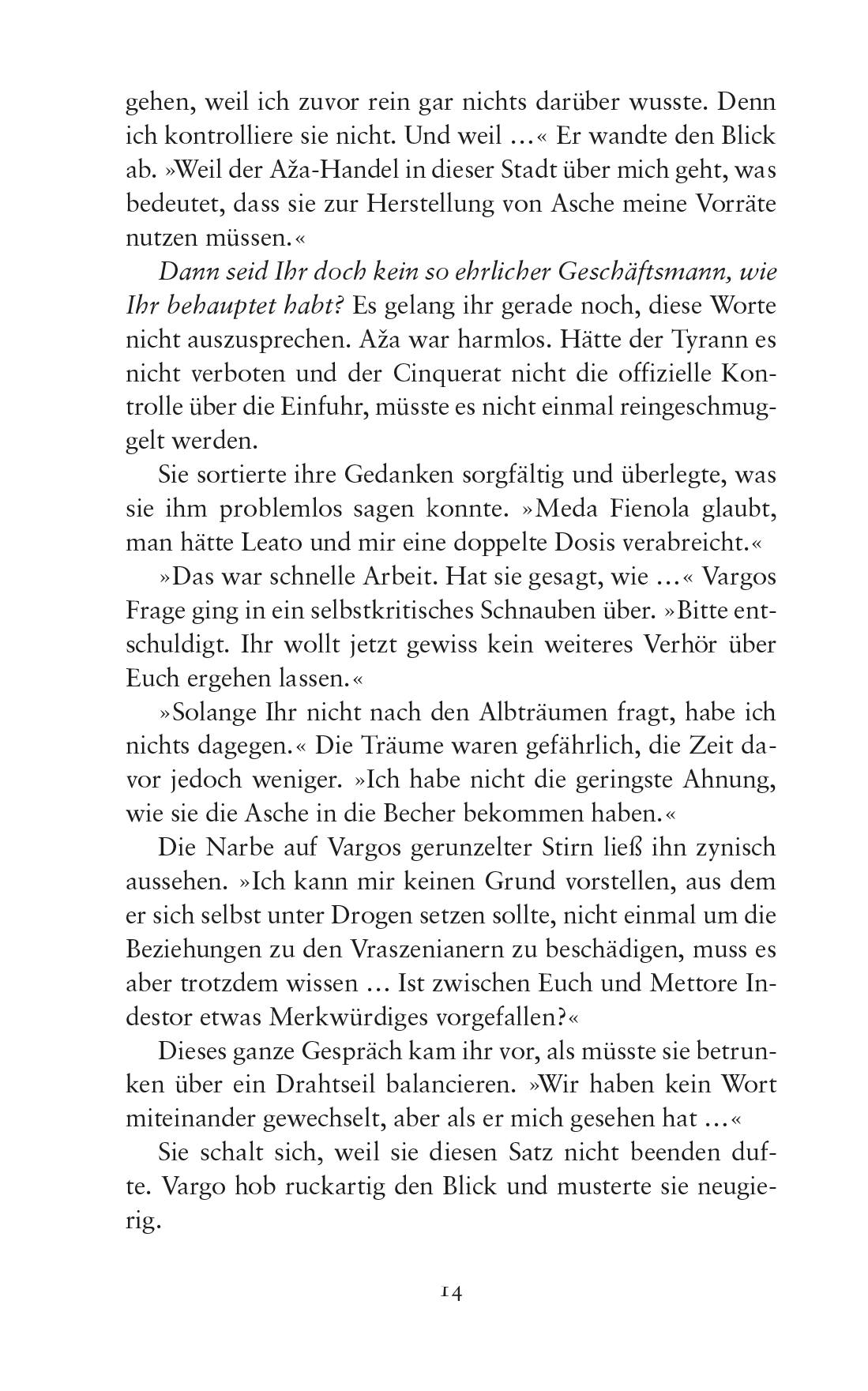 »Ihr müsst aufpassen, mit welchen Musterleserinnen Ihr Euch abgebt«, warnte Vargo Ren. »Die meisten von ihnen sind nur harmlose Betrügerinnen, aber manche verkaufen ihre Informationen. Era Novrus hat einige von ihnen in ihren Diensten.« Ihr doch bestimmt auch. Bei der Gnade der Masken – wenn sie nicht bald schlafen konnte, würde sie noch einen dieser Gedanken laut aussprechen. »Falls irgendjemand Geld dafür ausgegeben hat herauszufinden, dass ich mir wegen Haus Indestor Sorgen mache, dann bin nicht ich diejenige, die übers Ohr gehauen wird.« Vargo runzelte die Stirn. »Was hat die Musterleserin gesagt, das eine rationale Seterin-Adlige in eine Gläubige verwandeln könnte?« »Sie hat mich gewarnt, dass Mettore etwas plant, bei dem Magie im Spiel ist – sie wusste jedoch nicht, welcher Art oder warum. Dass er – jetzt oder in der Zukunft – rigoros vorgehen will und einen Wendepunkt erreichen will und dass er eine Macht entfesseln würde, die er nicht kontrollieren kann. Und dass das, was immer er tut, alles für immer verändern kann. Und …« Obwohl sie hinsichtlich ihrer Informationsquelle lügen musste, fiel es ihr schwer, die nächsten Worte auszusprechen. »Dass ich irgendwie damit zu tun habe. Dass Mettore … mich für irgendetwas braucht.« »Dass er Euch braucht«, murmelte Vargo und starrte in die Ferne. »Interessant. Ich wüsste zu gern, wie sie auf diese Idee gekommen ist.« Er schien nicht zu glauben, dass sie es aus einem Muster gelesen hatte. Nachdenklich fummelte er an seinem Kragen herum. »Magie. Inskription? Wenn er etwas tun wollte, das Euch als Fokus benötigt, würde das etwas sehr Schlechtes für Euch bedeuten – Ihr seid kein Gott, der endlos Energie kanalisiert von Lumen. Aber es gibt einfachere und subtilere Methoden, jemanden zu töten, falls das sein Ziel war.« »Ich bezweifle, dass er so etwas vorhatte … Es war vermutlich eher ein Unfall. Was immer er tut, so scheint er noch nicht fertig zu sein.«