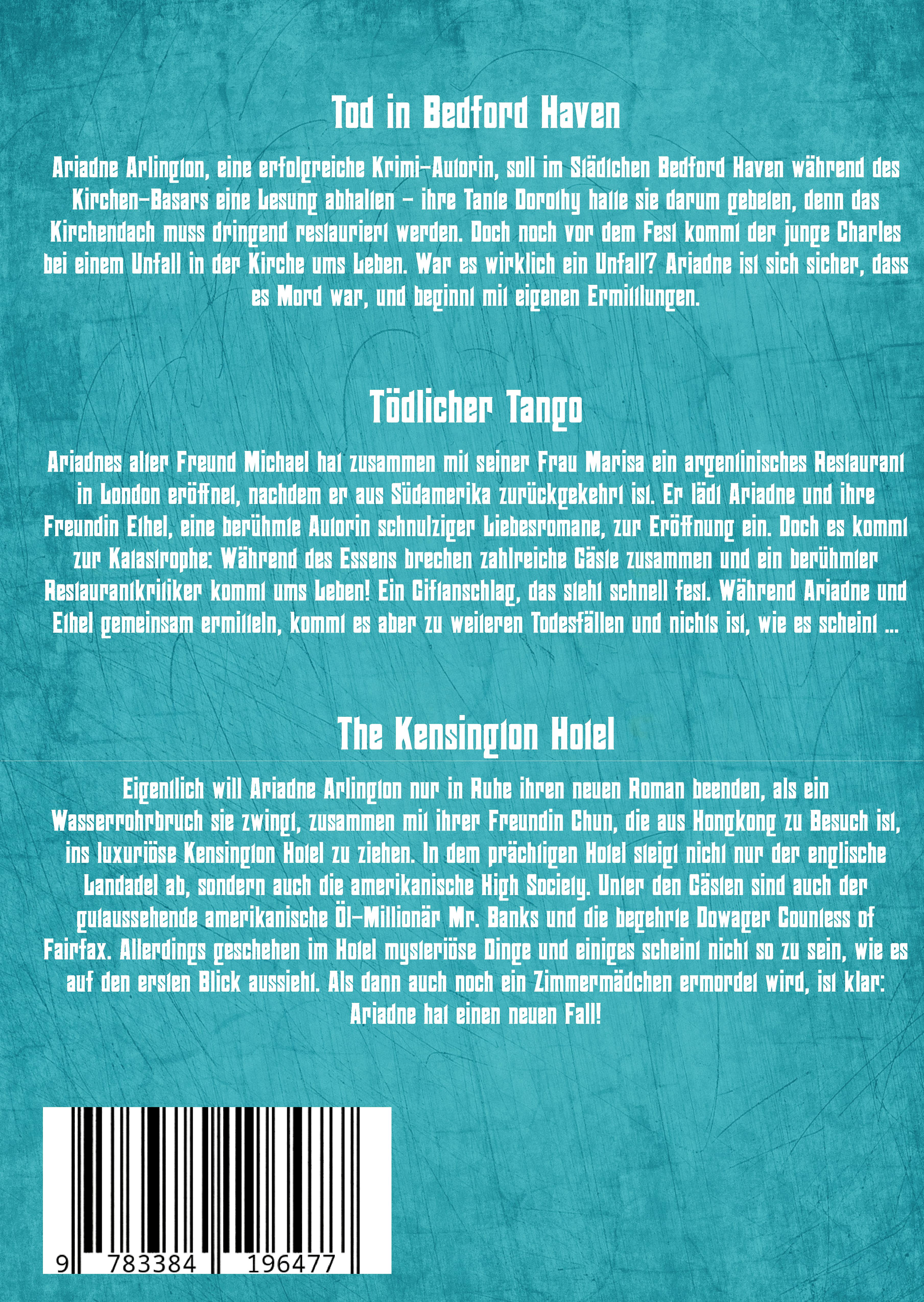 Ariadne Arlington - Krimiautorin und ErmittlerinAriadne Arlington, die Schöpferin des berühmten Ermittlers Roland Arford, gehört zu den bekanntesten Krimi-Autorinnen Englands! Doch nicht nur auf dem Papier widmet sie sich den Ermittlungen! Hin und wieder muss die berühmte Schriftstellerin ihr kriminalistisches Näschen einsetzen, um auch in ganz realen Fällen zu ermitteln!Tod in Bedford HavenAriadne Arlington, eine erfolgreiche Krimi-Autorin, soll im Städtchen Bedford Haven während des Kirchen-Basars eine Lesung abhalten - ihre Tante Dorothy hatte sie darum gebeten, denn das Kirchendach muss dringend restauriert werden. Doch noch vor dem Fest kommt der junge Charles bei einem Unfall in der Kirche ums Leben. War es wirklich ein Unfall? Ariadne ist sich sicher, dass es Mord war, und beginnt mit eigenen Ermittlungen.Tödlicher TangoAriadnes alter Freund Michael hat zusammen mit seiner Frau Marisa ein argentinisches Restaurant in London eröffnet, nachdem er aus Südamerika zurückgekehrt ist. Er lädt Ariadne und ihre Freundin Ethel, eine berühmte Autorin schnulziger Liebesromane, zur Eröffnung ein. Doch es kommt zur Katastrophe: Während des Essens brechen zahlreiche Gäste zusammen und ein berühmter Restaurantkritiker kommt ums Leben! Ein Giftanschlag, das steht schnell fest. Während Ariadne und Ethel gemeinsam ermitteln, kommt es aber zu weiteren Todesfällen und nichts ist, wie es scheint ...The Kensington HotelEigentlich will Ariadne Arlington nur in Ruhe ihren neuen Roman beenden, als ein Wasserrohrbruch sie zwingt, zusammen mit ihrer Freundin Chun, die aus Hongkong zu Besuch ist, ins luxuriöse Kensington Hotel zu ziehen. In dem prächtigen Hotel steigt nicht nur der englische Landadel ab, sondern auch die amerikanische High Society. Unter den Gästen sind auch der gutaussehende amerikanische Öl-Millionär Mr. Banks und die begehrte Dowager Countess of Fairfax. Allerdings geschehen im Hotel mysteriöse Dinge und einiges scheint nicht so zu sein, wie es auf den ersten Blick aussieht. Als dann auch noch ein Zimmermädchen ermordet wird, ist klar: Ariadne hat einen neuen Fall!