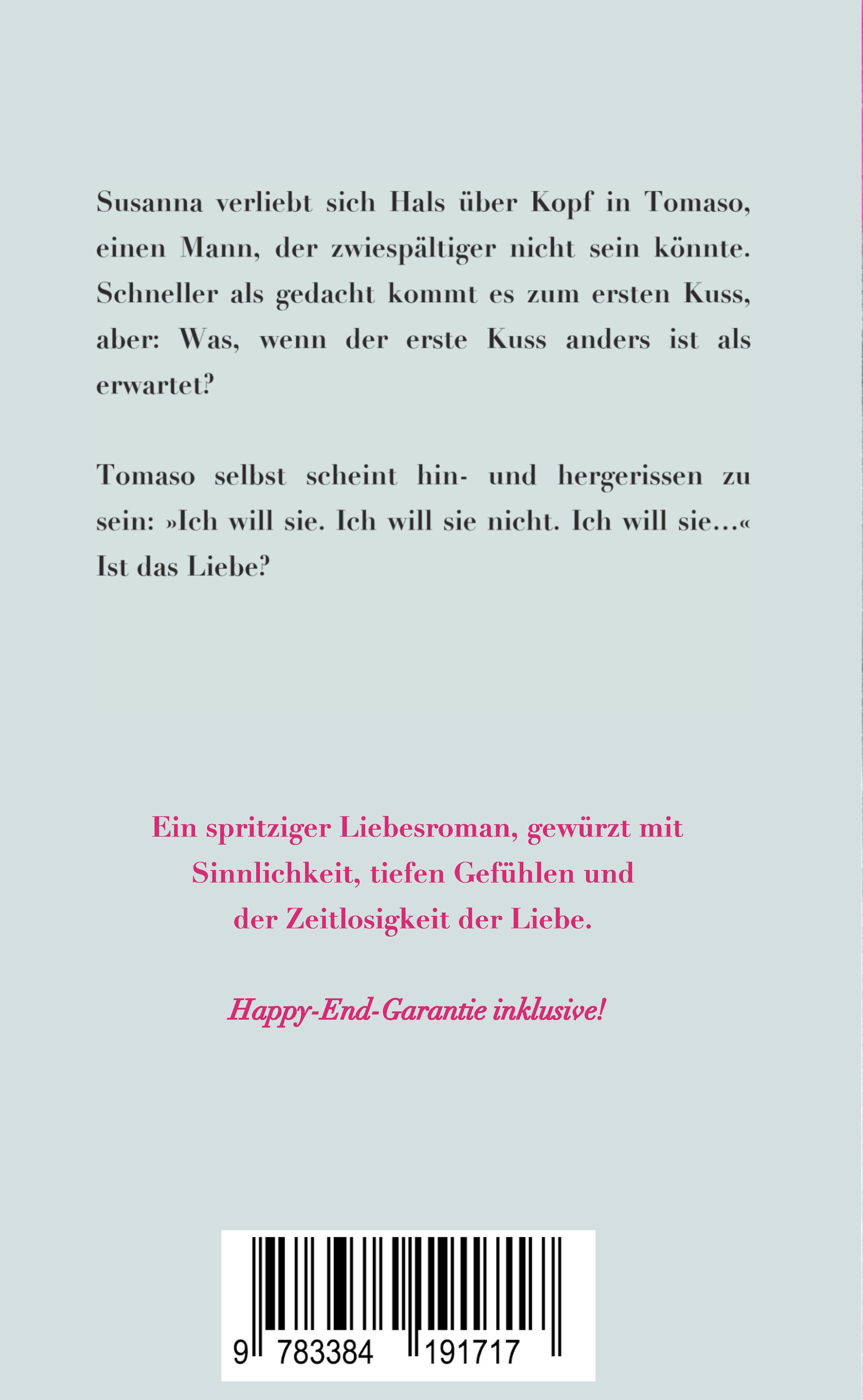 Susanna verliebt sich Hals über Kopf in Tomaso, einen Mann, der zwiespältiger nicht sein könnte. Schneller als gedacht kommt es zum ersten Kuss, aber: Was, wenn der erste Kuss anders ist als erwartet?Tomaso selbst scheint hin- und hergerissen zu sein: »Ich will sie. Ich will sie nicht. Ich will sie...« Ist das Liebe? Ein spritziger Liebesroman, gewürzt mit Sinnlichkeit, tiefen Gefühlen und der Zeitlosigkeit der Liebe. Happy-End-Garantie inklusive!