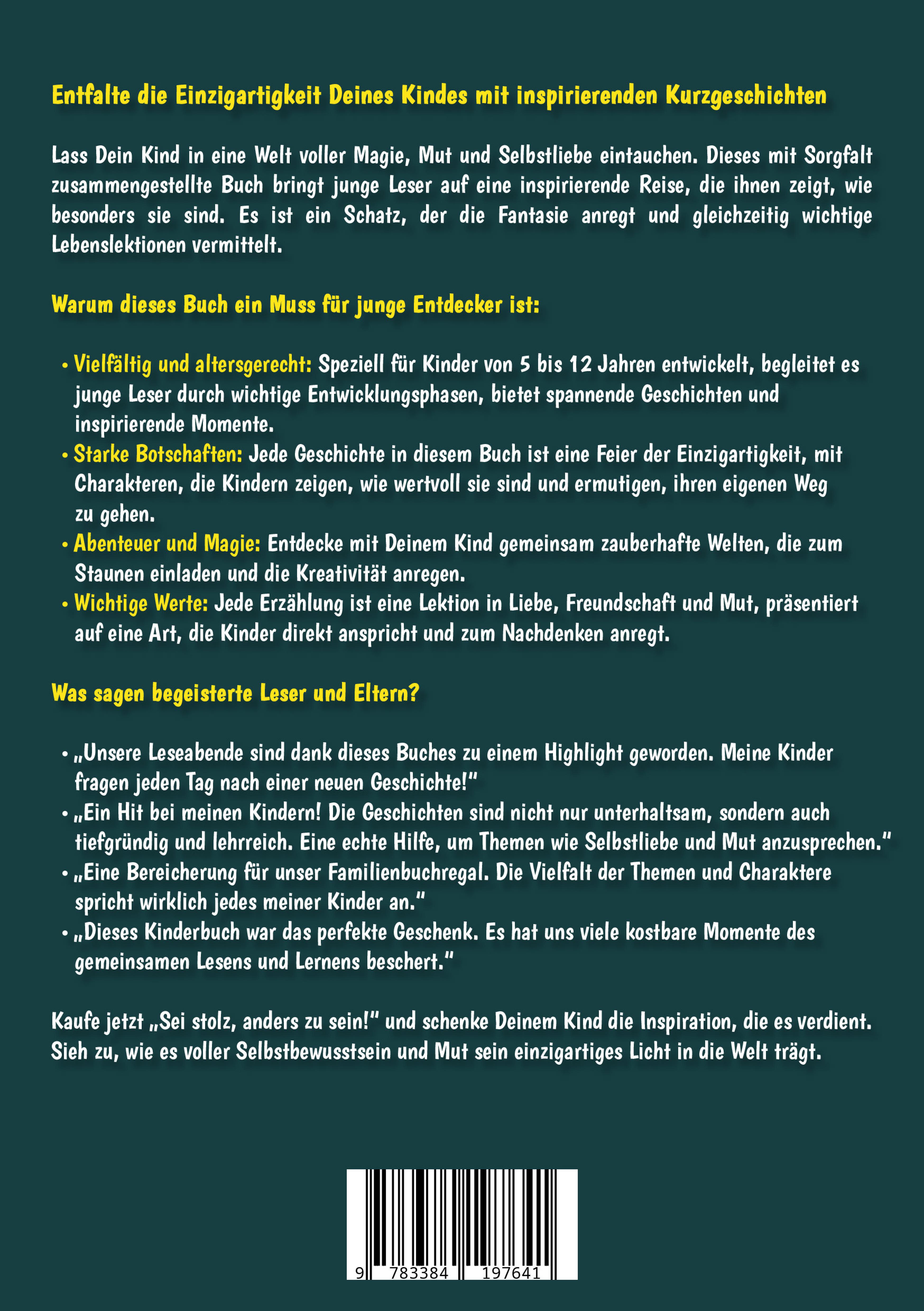 Entfalte die Einzigartigkeit Deines Kindes mit inspirierenden KurzgeschichtenLass Dein Kind in eine Welt voller Magie, Mut und Selbstliebe eintauchen. Dieses mit Sorgfalt zusammengestellte Buch bringt junge Leser auf eine inspirierende Reise, die ihnen zeigt, wie besonders sie sind. Es ist ein Schatz, der die Fantasie anregt und gleichzeitig wichtige Lebenslektionen vermittelt.Warum dieses Buch ein Muss für junge Entdecker ist:- Vielfältig und altersgerecht: Speziell für Kinder von 5 bis 12 Jahren entwickelt, begleitet es junge Leser durch wichtige Entwicklungsphasen, bietet spannende Geschichten und inspirierende Momente.- Starke Botschaften: Jede Geschichte in diesem Buch ist eine Feier der Einzigartigkeit, mit Charakteren, die Kindern zeigen, wie wertvoll sie sind und ermutigen, ihren eigenen Weg zu gehen.- Abenteuer und Magie: Entdecke mit Deinem Kind gemeinsam zauberhafte Welten, die zum Staunen einladen und die Kreativität anregen.- Wichtige Werte: Jede Erzählung ist eine Lektion in Liebe, Freundschaft und Mut, präsentiert auf eine Art, die Kinder direkt anspricht und zum Nachdenken anregt.Was sagen begeisterte Leser und Eltern?- "Unsere Leseabende sind dank dieses Buches zu einem Highlight geworden. Meine Kinder fragen jeden Tag nach einer neuen Geschichte!"- "Ein Hit bei meinen Kindern! Die Geschichten sind nicht nur unterhaltsam, sondern auch tiefgründig und lehrreich. Eine echte Hilfe, um Themen wie Selbstliebe und Mut anzusprechen."- "Eine Bereicherung für unser Familienbuchregal. Die Vielfalt der Themen und Charaktere spricht wirklich jedes meiner Kinder an."- "Dieses Kinderbuch war das perfekte Geschenk. Es hat uns viele kostbare Momente des gemeinsamen Lesens und Lernens beschert."Kaufe jetzt "Sei stolz, anders zu sein!" und schenke Deinem Kind die Inspiration, die es verdient. Sieh zu, wie es voller Selbstbewusstsein und Mut sein einzigartiges Licht in die Welt trägt.