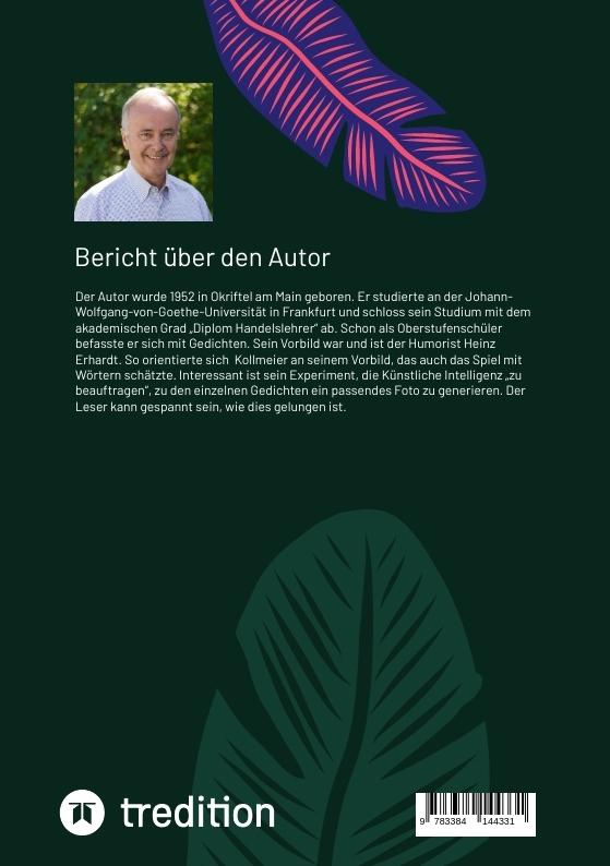 Der Autor wurde 1952 in Okriftel am Main geboren. Er studierte an der Johann-Wolfgang-von-Goethe-Universität in Frankfurt und schloss sein Studium mit dem akademischen Grad „Diplom Handelslehrer“ ab. Schon als Oberstufenschüler befasste er sich mit Gedichten. Sein Vorbild war und ist der Humorist Heinz Erhardt. So orientierte sich Kollmeier an seinem Vorbild, das auch das Spiel mit Wörtern schätzte. Interessant ist sein Experiment, die Künstliche Intelligenz „zu beauftragen“, zu den einzelnen Gedichten ein passendes Foto zu generieren. Der Leser kann gespannt sein, wie dies gelungen ist.
