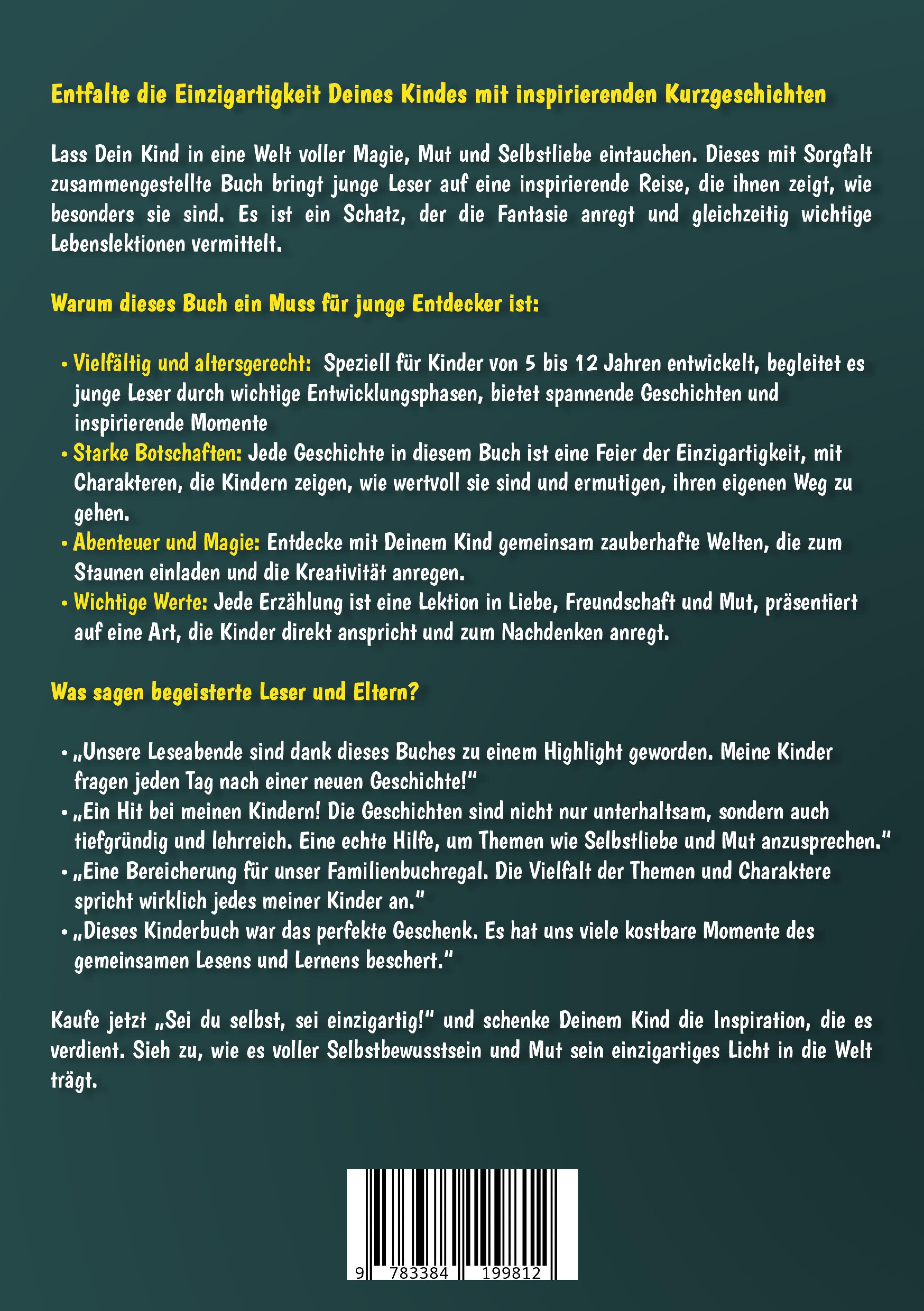 Entfalte die Einzigartigkeit Deines Kindes mit inspirierenden KurzgeschichtenLass Dein Kind in eine Welt voller Magie, Mut und Selbstliebe eintauchen. Dieses mit Sorgfalt zusammengestellte Buch bringt junge Leser auf eine inspirierende Reise, die ihnen zeigt, wie besonders sie sind. Es ist ein Schatz, der die Fantasie anregt und gleichzeitig wichtige Lebenslektionen vermittelt.Warum dieses Buch ein Muss für junge Entdecker ist:- Vielfältig und altersgerecht: Speziell für Kinder von 5 bis 12 Jahren entwickelt, begleitet es junge Leser durch wichtige Entwicklungsphasen, bietet spannende Geschichten und inspirierende Momente.- Starke Botschaften: Jede Geschichte in diesem Buch ist eine Feier der Einzigartigkeit, mit Charakteren, die Kindern zeigen, wie wertvoll sie sind und ermutigen, ihren eigenen Weg zu gehen.- Abenteuer und Magie: Entdecke mit Deinem Kind gemeinsam zauberhafte Welten, die zum Staunen einladen und die Kreativität anregen.- Wichtige Werte: Jede Erzählung ist eine Lektion in Liebe, Freundschaft und Mut, präsentiert auf eine Art, die Kinder direkt anspricht und zum Nachdenken anregt.Was sagen begeisterte Leser und Eltern?- "Unsere Leseabende sind dank dieses Buches zu einem Highlight geworden. Meine Kinder fragen jeden Tag nach einer neuen Geschichte!"- "Ein Hit bei meinen Kindern! Die Geschichten sind nicht nur unterhaltsam, sondern auch tiefgründig und lehrreich. Eine echte Hilfe, um Themen wie Selbstliebe und Mut anzusprechen."- "Eine Bereicherung für unser Familienbuchregal. Die Vielfalt der Themen und Charaktere spricht wirklich jedes meiner Kinder an."- "Dieses Kinderbuch war das perfekte Geschenk. Es hat uns viele kostbare Momente des gemeinsamen Lesens und Lernens beschert."Kaufe jetzt "Sei du selbst, sei einzigartig!" und schenke Deinem Kind die Inspiration, die es verdient. Sieh zu, wie es voller Selbstbewusstsein und Mut sein einzigartiges Licht in die Welt trägt.