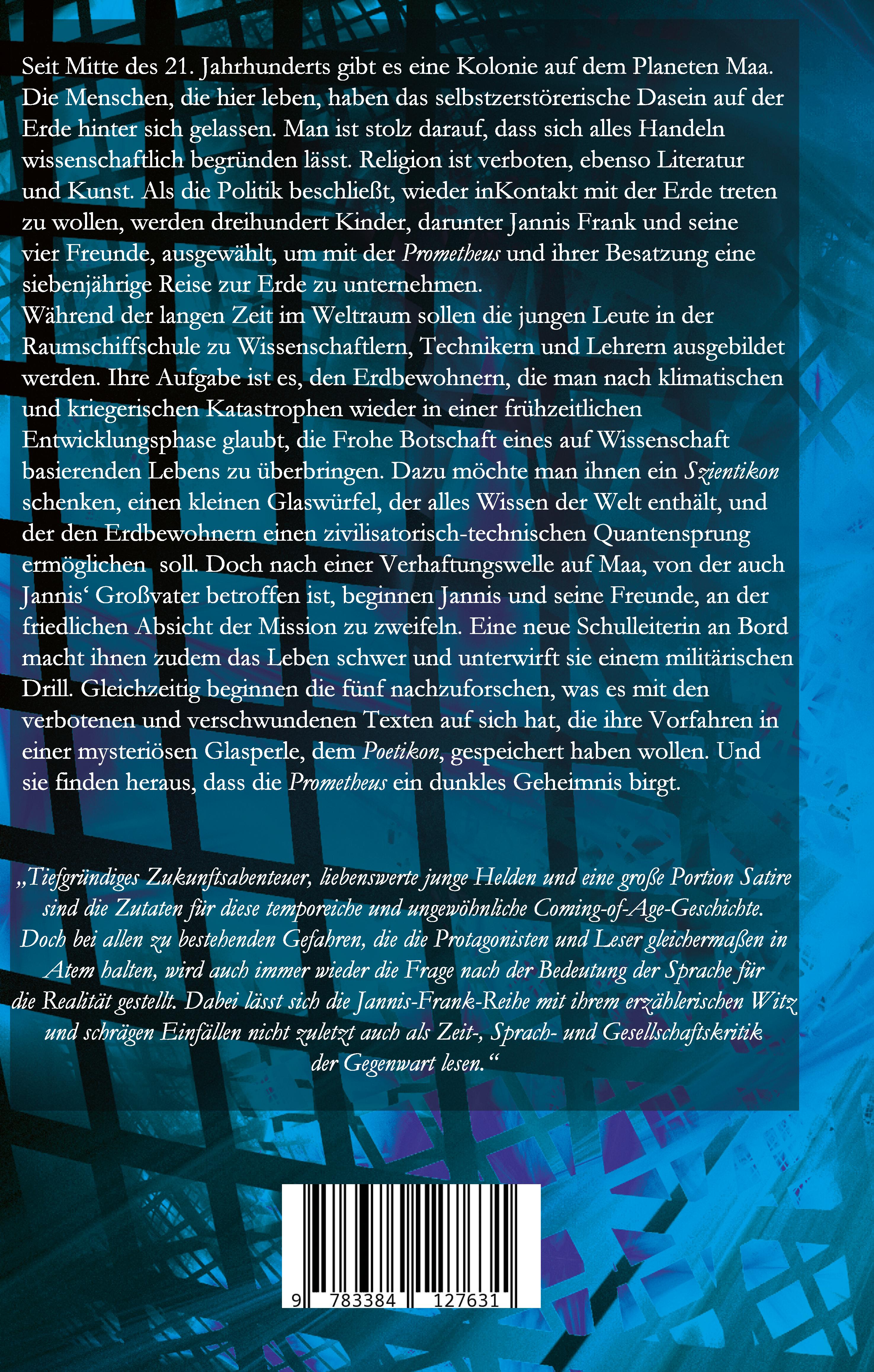 Seit Mitte des 21. Jahrhunderts gibt es eine Kolonie auf dem Planeten Maa. Die Menschen, die hier leben, haben das selbstzerstörerische Dasein auf der Erde hinter sich gelassen. Man ist stolz darauf, dass sich alles Handeln wissenschaftlich begründen lässt. Religion ist verboten, ebenso Literatur und Kunst. Als die Politik beschließt, wieder in Kontakt mit der Erde treten zu wollen, werden dreihundert Kinder, darunter Jannis Frank und seine vier Freunde, ausgewählt, um mit der Prometheus und ihrer Besatzung eine siebenjährige Reise zum einstigen Heimatplaneten zu unternehmen. Während der langen Zeit im Weltraum sollen die jungen Leute in der Raumschiffschule zu Wissenschaftlern, Technikern und Lehrern ausgebildet werden. Ihre Aufgabe ist es, den Erdbewohnern, die man nach klimatischen und kriegerischen Katastrophen wieder in einer frühzeitlichen Entwicklungsphase glaubt, die Frohe Botschaft eines auf Wissenschaft basierenden Lebens zu überbringen. Dazu möchte man ihnen ein Szientikon schenken, einen kleinen Glaswürfel, der alles Wissen der Welt enthält, und der den Erdbewohnern einen zivilisatorisch-technischen Quantensprung ermöglichen soll. Doch nach einer Verhaftungswelle auf Maa, von der auch Jannis' Großvater betroffen ist, beginnen Jannis und seine Freunde, an der friedlichen Absicht der Mission zu zweifeln. Eine neue Schulleiterin an Bord macht ihnen zudem schon bald das Leben schwer und unterwirft sie einem militärischen Drill. Gleichzeitig beginnen die fünf nachzuforschen, was es mit den verbotenen und verschwundenen Texten auf sich hat, die ihre Vorfahren in einer mysteriösen Glasperle, dem Poetikon, gespeichert haben wollen. Und sie finden heraus, dass die Prometheus ein dunkles Geheimnis birgt."Tiefgründiges Zukunftsabenteuer, liebenswerte junge Helden und eine große Portion Satire sind die Zutaten für diese temporeiche und ungewöhnliche Coming-of-Age-Geschichte. Doch bei allen zu bestehenden Gefahren, die die Protagonisten und Leser gleichermaßen in Atem halten, wird auch immer wieder die Frage nach der Bedeutung der Sprache für die Realität gestellt. Dabei lässt sich die Jannis-Frank-Reihe mit ihrem erzählerischen Witz und schrägen Einfällen nicht zuletzt als Zeit-, Sprach- und Gesellschaftskritik der Gegenwart lesen."