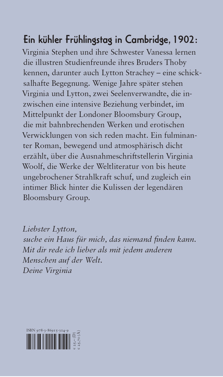 | Schlagworte | Autorenleben • Bloomsberries • Bloomsbury • Bloomsbury Group • Bloomsbury-Gruppe • Bloomsbury-Mitglieder • Briefwechsel • Cambridge • Elitär • Emanzipation • Frauenbewegung • Freundschaft • Ikone • intellektuellen • Künstlergruppe • Künstlerseelen • Leonard Woolf • Liebe • Literaturgeschichte • London • Originalzitaten • Rebellen • Schriftsteller • Schriftstellerin • Schriftstellerleben • Schwester • Seelenverwandtschaft • Thoby Stephen • tragische Liebe • Vanessa Stephen |