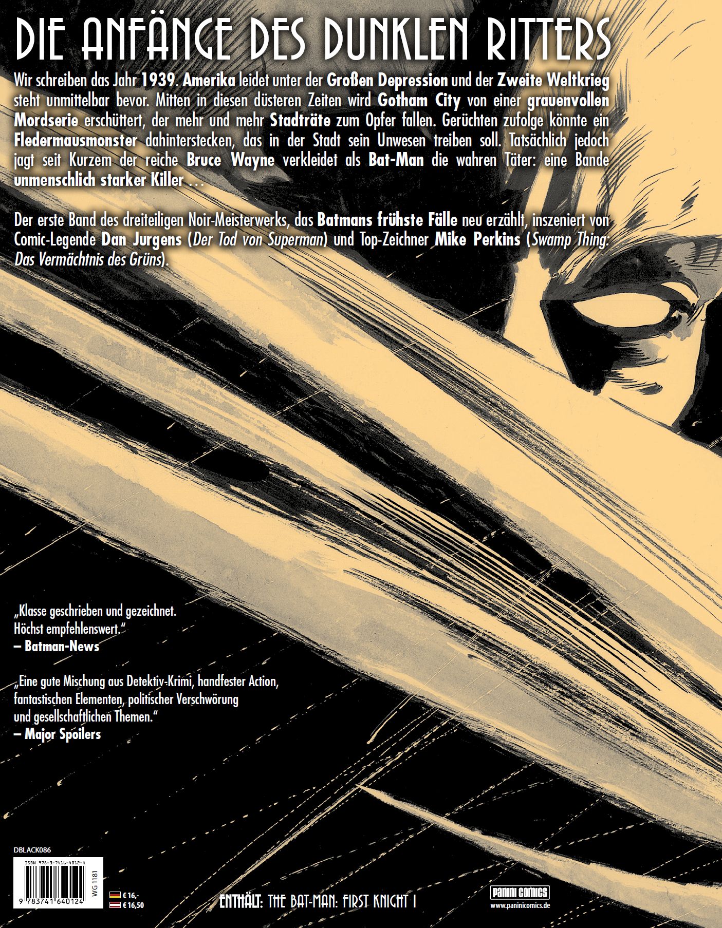 DIE ANFÄNGE DES DUNKLEN RITTERSWir schreiben das Jahr 1939. Amerika leidet unter der Großen Depression und der Zweite Weltkrieg steht unmittelbar bevor. Mitten in diesen düsteren Zeiten wird Gotham City von einer grauenvollen Mordserie erschüttert, der mehr und mehr Stadträte zum Opfer fallen. Gerüchten zufolge könnte ein Fledermausmonster dahinterstecken, das in der Stadt sein Unwesen treiben soll. Tatsächlich jedoch jagt der reiche Bruce Wayne seit Kurzem verkleidet als Bat-Man die wahren Täter: eine Bande unmenschlich starker Killer ... Der erste Band des dreiteiligen Noir-Meisterwerks, das Batmans frühste Fälle neu erzählt, inszeniert von Comic-Legende Dan Jurgens (Der Tod von Superman) und Top-Zeichner Mike Perkins (Swamp Thing).ENTHÄLT: THE BAT-MAN: FIRST KNIGHT 1