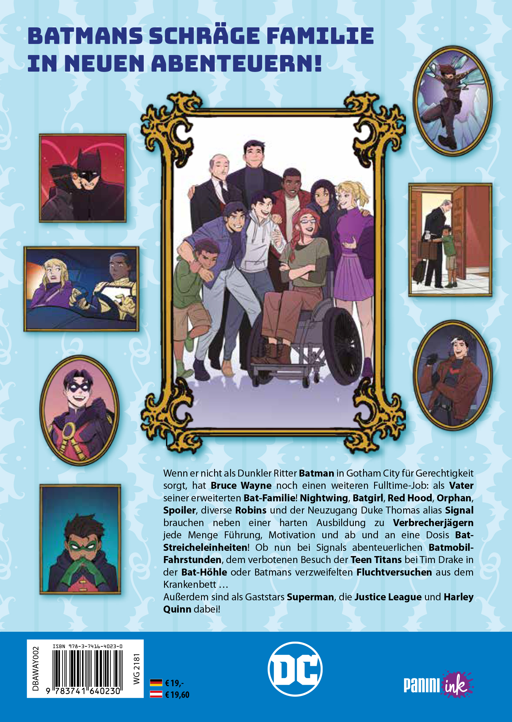 Batman hat nicht nur mit Gangstern und Superschurken alle Hände voll zu tun! In Wayne Manor gibt es mit Nightwing, Batgirl, Red Hood, Orphan, Spoiler, einigen Robins und dem Newcomer Signal keinen Mangel an adoptierten, angenommenen und leiblichen Kindern, die alle lernen müssen, was es heißt, ein Held zu sein, den ersten Liebeskummer zu ertragen und sich mit anderen Superkids wie Impulse und Wonder Girl zu messen!