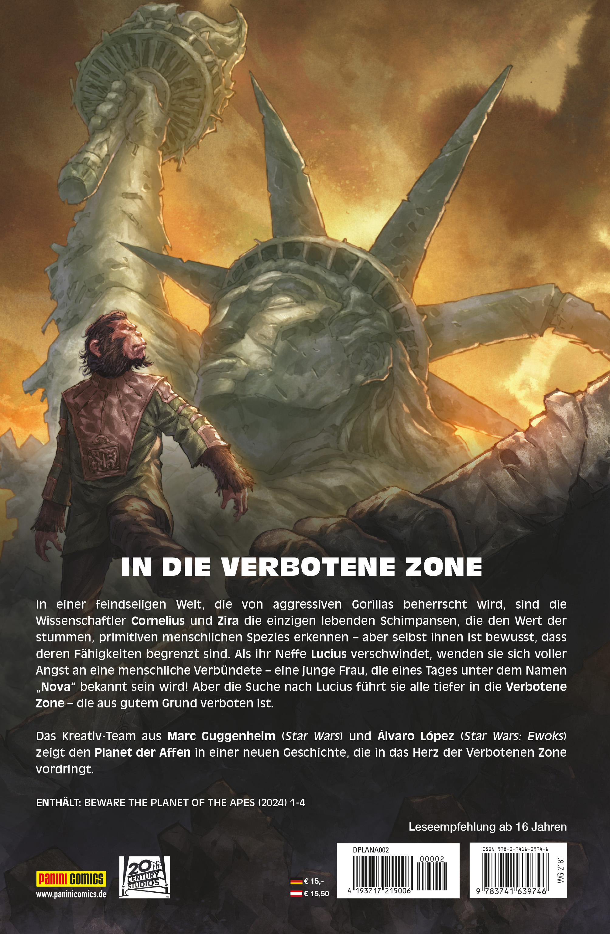 IN DIE VERBOTENE ZONEIn einer feindseligen Welt, die von aggressiven Gorillas beherrscht wird, sind die Wissenschaftler Cornelius und Zira die einzigen lebenden Schimpansen, die den Wert der stummen, primitiven menschlichen Spezies erkennen - aber selbst ihnen ist bewusst, dass deren Fähigkeiten begrenzt sind. Als ihr Neffe Lucius verschwindet, wenden sie sich voller Angst an eine menschliche Verbündete - eine junge Frau, die eines Tages unter dem Namen "Nova" bekannt sein wird! Aber die Suche nach Lucius führt sie alle tiefer in die Verbotene Zone - die aus gutem Grund verboten ist. Das Kreativ-Team aus Marc Guggenheim (Star Wars) und Alvaro López (Star Wars: Ewoks) zeigt den Planet der Affen in einer neuen Geschichte, die in das Herz der Verbotenen Zone hervordringt.ENTHÄLT: BEWARE THE PLANET OF APES (2024) 1-4