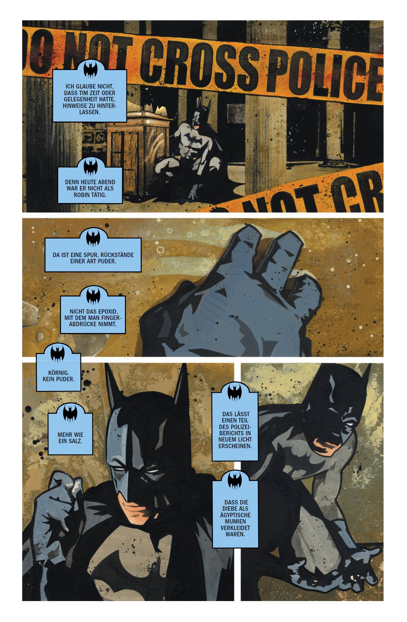 UNSTERBLICHKEIT UND FINSTERNIS von Jörg Faßbender Der Tod und die Aussicht auf ewiges Leben begegnen Bruce Wayne alias Batman gleich mehrfach in diesen drei von John Van Fleet illustrierten Storys: In der ersten muss Bruce den Heiligen Gral in seine Obhut nehmen und dafür sorgen, dass dieser nicht in die falschen Hände gerät, beispielsweise in die von Ra‘s al Ghul, Catwoman oder Pinguin, die alle drei aus unterschiedlichen Gründen an dem Kelch interessiert sind. Beim Pinguin ist es reine Gier und für Catwoman eine weitere Möglichkeit, ihre diebischen Fähigkeiten auszureizen. Für Ra‘s geht es jedoch definitiv um die Eigenschaften, die dem Gral zugeschrieben werden, denn angeblich kann er ewige Jugend verleihen. Ra‘s selbst ist zwar bereits unsterblich, möchte das ewige Leben aber jemand anderem ermöglichen. Obendrein ist noch ein Kult hinter der Reliquie her, die ähnliche Macht besitzen soll wie die heilige Longinuslanze. Die Themen sind hier Religiosität und Glaube – und wohin diese führen können. Auch in „Das Ankh“ spielen Religion und Unsterblichkeit eine Rolle beziehungsweise der Glaube, den Tod überwinden zu können. Ein solcher Versuch liegt in der Story einige Tausend Jahre zurück. Anscheinend ist dies einem Wissenschaftler bei den frühen Pharaonen gelungen, in Erfüllung des Befehls, den toten Sohn des damaligen Pharaos wieder zum Leben zu erwecken. Ähnlich wie bei Ra‘s al Ghul stellt sich bei der unsterblichen Ägypterin Khatera nun allerdings die Frage, ob die Unsterblichkeit eher Segen oder doch Fluch für sie ist. Ihre Pläne, diese zu beenden, und auch die Folgen dieser Pläne beantworten die Frage recht eindeutig. Ob Fluch, ob Segen, auch bei Poison Ivys Story stellt sich diese Frage bezüglich ihrer Pflanzenforschungen. Ihre Gewächse könnten ein Segen für die Menschheit sein, für Heilung sorgen, eine günstige Grundlage für Papier ermöglichen oder eine nachwachsende Alternative zu Insektiziden und für Stahlkonstruktionen bieten. Da Ivys Fenster im Arkham Asylum aber vom immer länger werdenden Schatten eines Gebäudes verdunkelt wird, ist sie verzweifelt und in Sorge um ihre Pflanzen. In der Folge sterben einige Menschen, die mit der Planung und dem Bau des genannten Gebäudes zu tun hatten. Batman muss herausfinden, ob Ivy da ihre Finger – oder besser gesagt ihre Ranken – im Spiel hat. Allen drei Geschichten ist gemein, dass ihr jeweiliges Thema recht düster und geheimnisvoll ist, und da scheint John Van Fleets gemalte Kunst passend. Er selbst betrachtet seine Illustrationen nach eigenem Bekunden nicht als düster: „Also, ich setze viel Schwarz ein, aber ich nutze es als Farbe und als Designelement, daher sehe ich das wohl anders. Man sagt eine Menge Dinge über meine Kunst, manche kann ich nachvollziehen und verstehen, andere nicht. Am häufigsten höre ich, sie sei düster und stimmungsvoll. Ich mag einfach eine schöne, urbane Rauheit, das ist alles.“ In diesem Sinne viel Vergnügen mit dieser manchmal durchaus etwas düsteren, urbanen Rauheit!