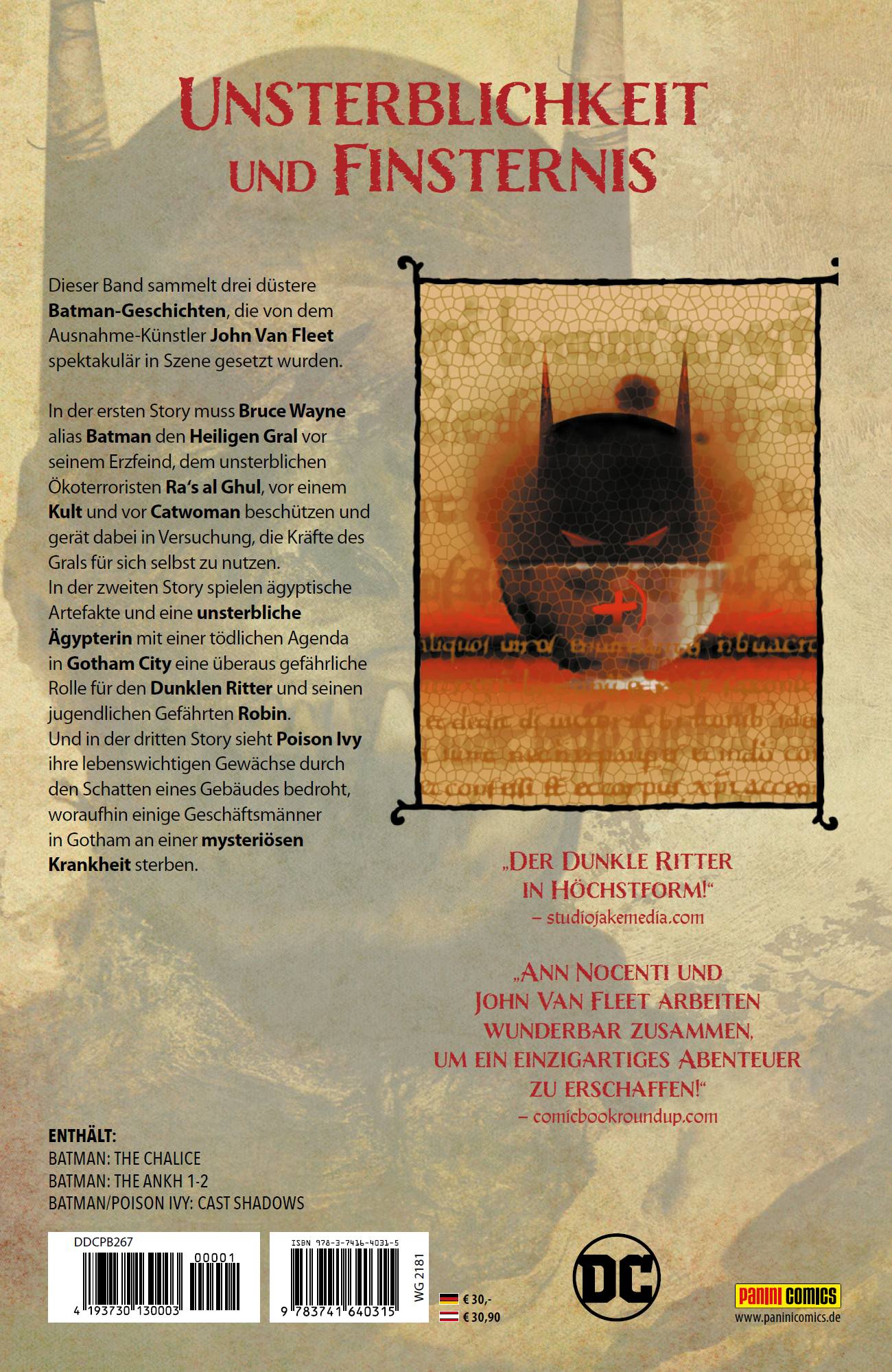 UNSTERBLICHKEIT UND FINSTERNIS Dieser Band sammelt drei düstere Batman-Geschichten, die von dem Ausnahme-Künstler John Van Fleet spektakulär in Szene gesetzt wurden.In der ersten Story muss Bruce Wayne alias Batman den Heiligen Gral vor seinem Erzfeind, dem unsterblichen Ökoterroristen Ra's al Ghul, vor einem Kult und vor Catwoman beschützen und gerät dabei in Versuchung, die Kräfte des Grals für sich selbst zu nutzen. In der zweiten Story spielen ägyptische Artefakte und eine unsterbliche Ägypterin mit einer tödlichen Agenda in Gotham City eine überaus gefährliche Rolle für den Dunklen Ritter und seinen jugendlichen Gefährten Robin. Und in der dritten Story sieht Poison Ivy ihre lebenswichtigen Gewächse durch den Schatten eines Gebäudes bedroht, woraufhin einige Geschäftsmänner in Gotham an einer mysteriösen Krankheit sterben.ENTHÄLT: BATMAN: THE CHALICE, BATMAN: THE ANKH 1-2, BATMAN/POISON IVY: CAST SHADOWS