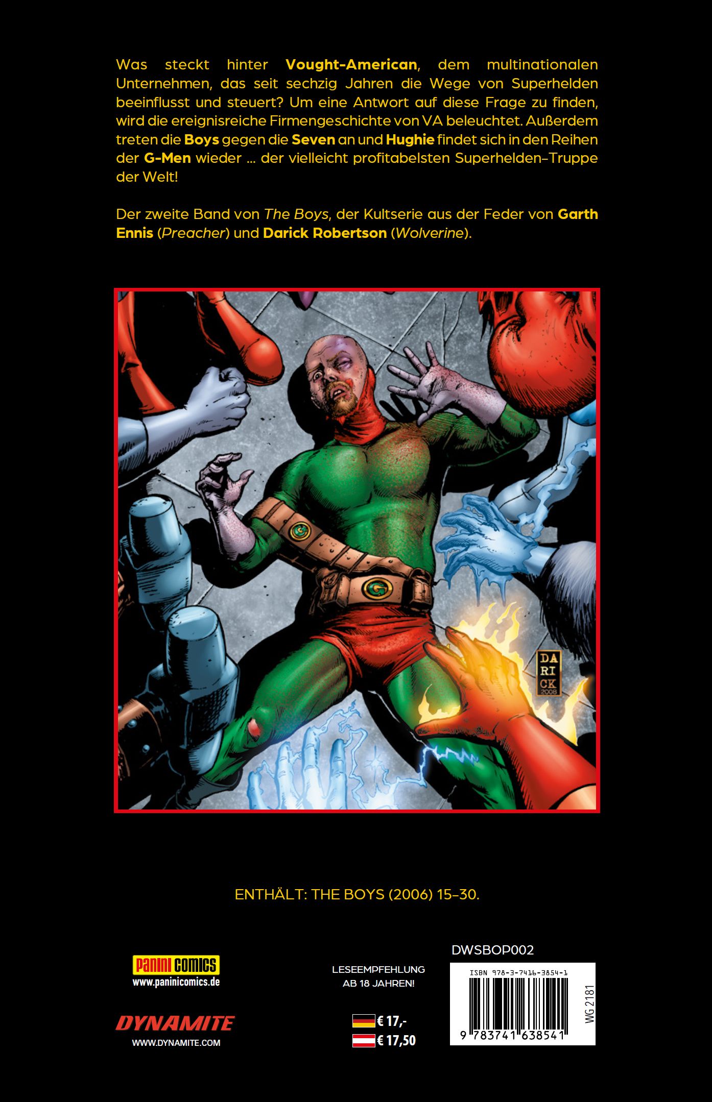 Was steckt hinter Vought-American, dem multinationalen Unternehmen, das seit sechzig Jahren die Wege von Superhelden beeinflusst und steuert? Um eine Antwort auf diese Frage zu finden, wird die ereignisreiche Firmengeschichte von VA beleuchtet. Außerdem treten die Boys gegen die Seven an und Hughie findet sich in den Reihen der G-Men wieder ... der vielleicht profitabelsten Superhelden-Truppe der Welt! Der zweite Band von The Boys, der Kultserie aus der Feder von Garth Ennis (Preacher) und Darick Robertson (Wolverine). ENTHÄLT: THE BOYS (2006) 15-30. LESEEMPFEHLUNG AB 18 JAHREN!