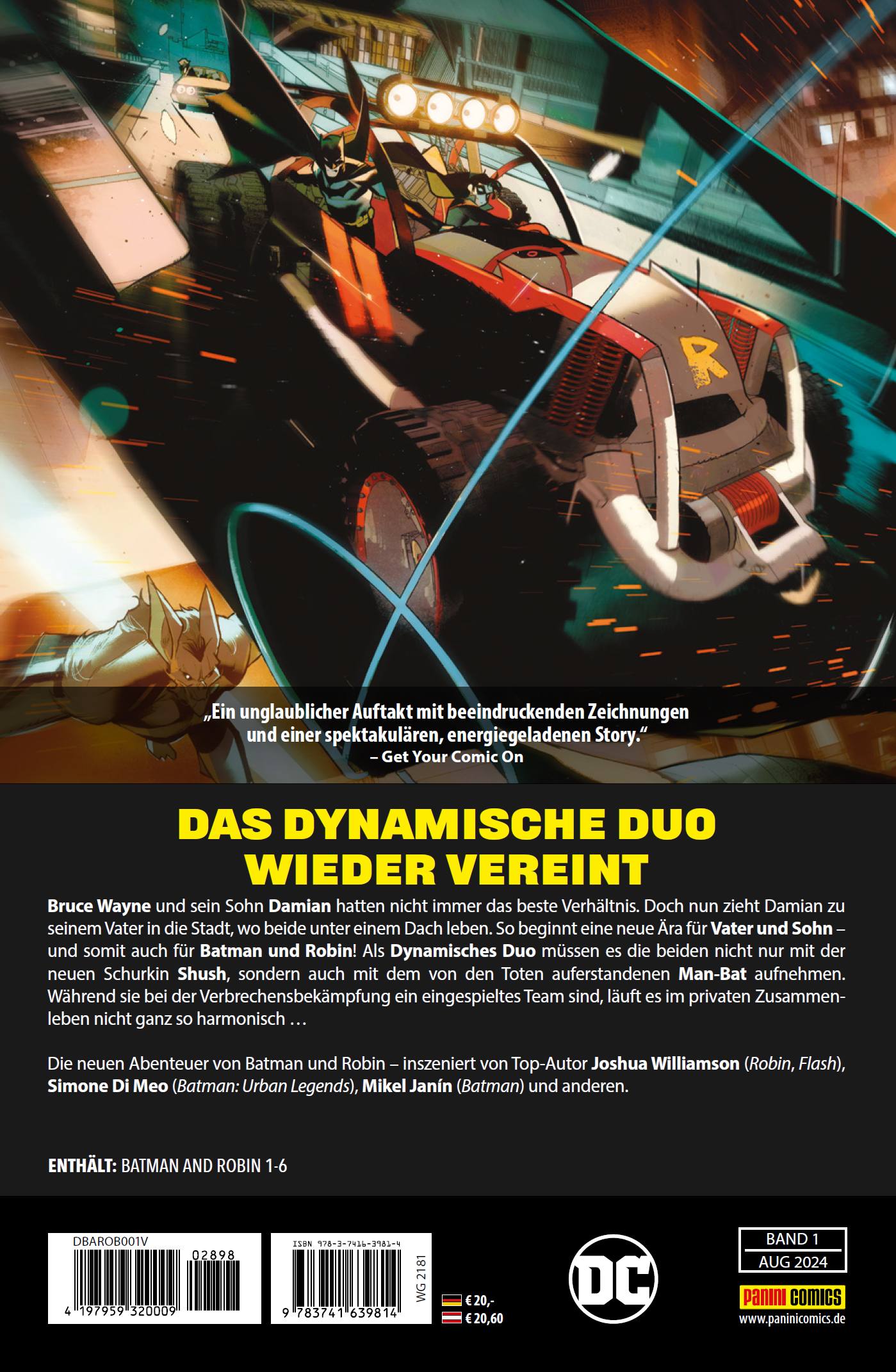 DAS DYNAMISCHE DUO WIEDER VEREINTBruce Wayne und sein Sohn Damian hatten nicht immer das beste Verhältnis. Doch nun zieht Damian zu seinem Vater in die Stadt, wo beide unter einem Dach leben. So beginnt eine neue Ära für Vater und Sohn - und somit auch für Batman und Robin! Als Dynamisches Duo müssen es die beiden nicht nur mit der neuen Schurkin Shush, sondern auch mit dem von den Toten auferstandenen Man-Bat aufnehmen. Während sie bei der Verbrechensbekämpfung ein eingespieltes Team sind, läuft es im privaten Zusammenleben nicht ganz so harmonisch ... Die neuen Abenteuer von Batman und Robin - inszeniert von Top-Autor Joshua Williamson (Robin, Flash), Simone Di Meo (Batman: Urban Legends), Mikel Janín (Batman) und anderen.ENTHÄLT: BATMAN AND ROBIN 1-6