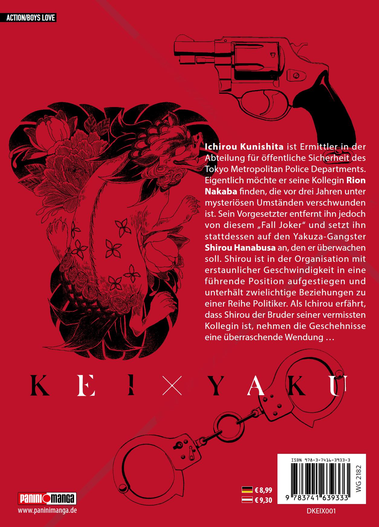 KEI X YAKU erzählt die spannende Geschichte eines Polizisten und eines Yakuza-Mitglieds, die gezwungen sind, zusammenzuarbeiten, um eine gefährliche Verschwörung aufzudecken. Während sie ihre Differenzen überwinden, entwickeln sie eine unerwartete Bindung ... Erlebe die packende Dynamik und die tiefgründigen Charaktere in diesem fesselnden Manga!Das erwartet dich in Band 1:Ichirou Kunishita ist Ermittler in der Abteilung für öffentliche Sicherheit des Tokyo Metropolitan Police Departments. Eigentlich möchte er seine Kollegin Rion Nakaba finden, die vor drei Jahren unter mysteriösen Umständen verschwunden ist. Sein Vorgesetzter entfernt ihn jedoch von diesem "Fall Joker" und setzt ihn stattdessen auf den Yakuza-Gangster Shirou Hanabusa an, den er überwachen soll. Shirou ist in der Organisation mit erstaunlicher Geschwindigkeit in eine führende Position aufgestiegen und unterhält zwielichtige Beziehungen zu einer Reihe Politiker. Als Ichirou erfährt, dass Shirou der Bruder seiner vermissten Kollegin ist, nehmen die Geschehnisse eine überraschende Wendung ...Für Fans von Action-, Krimi-, Mystery- und Boys-Love-Manga!