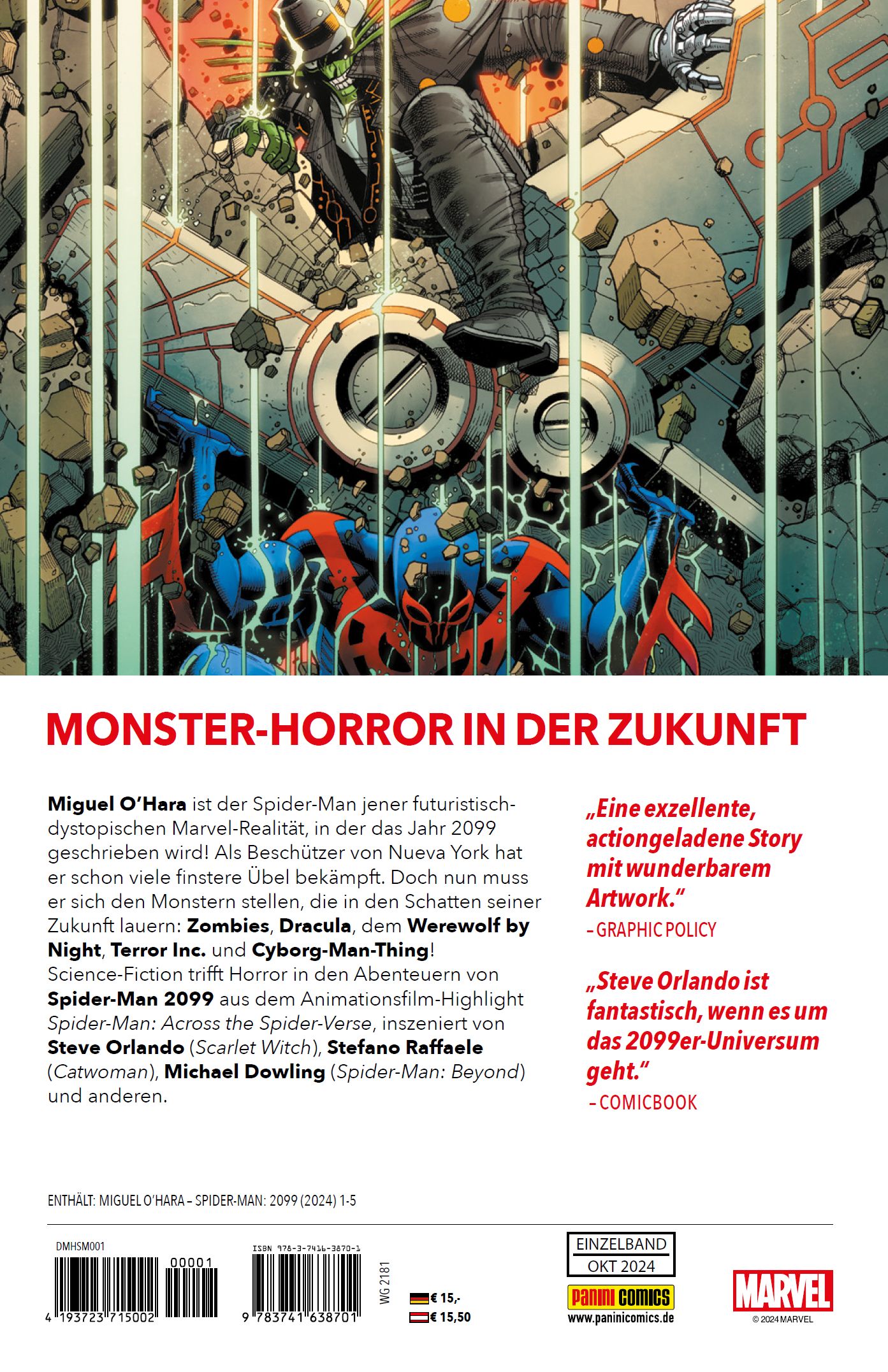 VORWORT von Christian EndresDie Geschichte von Miguel O'Hara als Spider- Man des Jahres 2099 begann 1992. Damals entführten Stan Lee, Peter David, Rick Leonardi und andere Kreative erstmals in die dystopische, vom Konzernriesen Alchemax beherrschte Realität der möglichen Marvel- Zukunft in 2099. Über die Jahre erschienen viele Comics mit Spider-Man 2099 - mit den in diesem Band enthaltenen US-Heften können nun stolze 100 US-Ausgaben um ihn zelebriert werden, wenn man nach Marvels Legacy- Mathematik alle Inkarnationen eines Titels addiert. Der durch Gentechnik mit Super- bzw. Spinnenkräften ausgestattete Netzschwinger von morgen, der dank des Animationsfilms Spider-Man: Across the Spider-Verse von 2023 bekannter ist denn je, kann auf seine digitale Assistentin Lyla vertrauen, verfügt über Nachtsicht und hat sogar Krallen und Fangzähne. Im Folgenden wird der Spidey von Erde-2099, die Elemente verschiedener Marvel 2099-Konzepte vereint, mit Monstern konfrontiert, die alle eine Marvel-Vergangenheit haben: Die Marvel Zombies gehen auf eine Story von Stan Lee und Bill Everett zurück, die 1953 in Menace 5 erschien. 1973 gaben Roy Thomas, Steve Gerber und John Buscema in Zombie 1 dem Untoten Simon Garth einen Namen und eine Historie. Auch Dracula war in den 1950ern erstmals in einem Marvel-Comic zu sehen, aber sein Stern ging 1972 mit der Comic-Serie Die Gruft von Dracula von Gerry Conway, Gene Colan und Co. auf, in der er sich unter anderem mit Vampirjäger Blade anlegte. Jack Russell heulte als Werewolf by Night in Marvel Spotlight 2 von Roy und Jean Thomas, Gerry Conway und Mike Ploog 1972 erstmals den Mond an. Shreck alias Terror Inc. ist eine Schöpfung von D. G. Chichester, Margaret Clark und Klaus Janson - der nicht alternde Antiheld hatte 1988 seinen ersten Auftritt unter Marvels Epic-Ableger und wurde 1992 ins reguläre Marvel-Universum überführt. Dort wurde Ted Sallis bereits 1971 in einer Story für Savage Tales 1 von Lee, Thomas, Conway und Gray Morrow zu Man-Thing, das auf Furcht reagiert und ein Nexus aller Realitäten ist ...