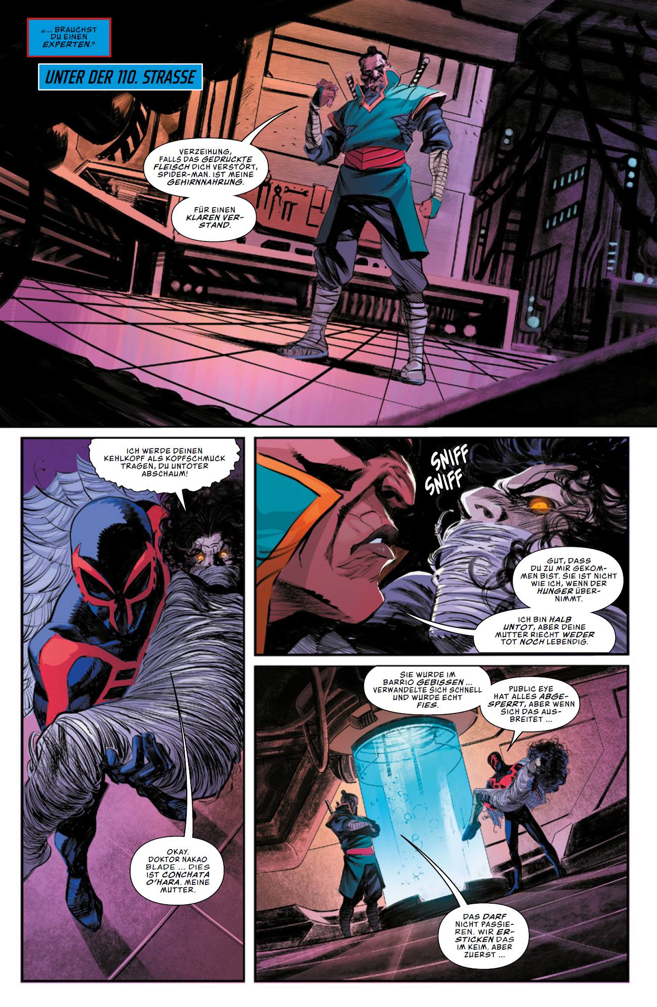 VORWORT von Christian Endres Die Geschichte von Miguel O’Hara als Spider- Man des Jahres 2099 begann 1992. Damals entführten Stan Lee, Peter David, Rick Leonardi und andere Kreative erstmals in die dystopische, vom Konzernriesen Alchemax beherrschte Realität der möglichen Marvel- Zukunft in 2099. Über die Jahre erschienen viele Comics mit Spider-Man 2099 – mit den in diesem Band enthaltenen US-Heften können nun stolze 100 US-Ausgaben um ihn zelebriert werden, wenn man nach Marvels Legacy- Mathematik alle Inkarnationen eines Titels addiert. Der durch Gentechnik mit Super- bzw. Spinnenkräften ausgestattete Netzschwinger von morgen, der dank des Animationsfilms Spider-Man: Across the Spider-Verse von 2023 bekannter ist denn je, kann auf seine digitale Assistentin Lyla vertrauen, verfügt über Nachtsicht und hat sogar Krallen und Fangzähne. Im Folgenden wird der Spidey von Erde-2099, die Elemente verschiedener Marvel 2099-Konzepte vereint, mit Monstern konfrontiert, die alle eine Marvel-Vergangenheit haben: Die Marvel Zombies gehen auf eine Story von Stan Lee und Bill Everett zurück, die 1953 in Menace 5 erschien. 1973 gaben Roy Thomas, Steve Gerber und John Buscema in Zombie 1 dem Untoten Simon Garth einen Namen und eine Historie. Auch Dracula war in den 1950ern erstmals in einem Marvel-Comic zu sehen, aber sein Stern ging 1972 mit der Comic-Serie Die Gruft von Dracula von Gerry Conway, Gene Colan und Co. auf, in der er sich unter anderem mit Vampirjäger Blade anlegte. Jack Russell heulte als Werewolf by Night in Marvel Spotlight 2 von Roy und Jean Thomas, Gerry Conway und Mike Ploog 1972 erstmals den Mond an. Shreck alias Terror Inc. ist eine Schöpfung von D. G. Chichester, Margaret Clark und Klaus Janson – der nicht alternde Antiheld hatte 1988 seinen ersten Auftritt unter Marvels Epic-Ableger und wurde 1992 ins reguläre Marvel-Universum überführt. Dort wurde Ted Sallis bereits 1971 in einer Story für Savage Tales 1 von Lee, Thomas, Conway und Gray Morrow zu Man-Thing, das auf Furcht reagiert und ein Nexus aller Realitäten ist …