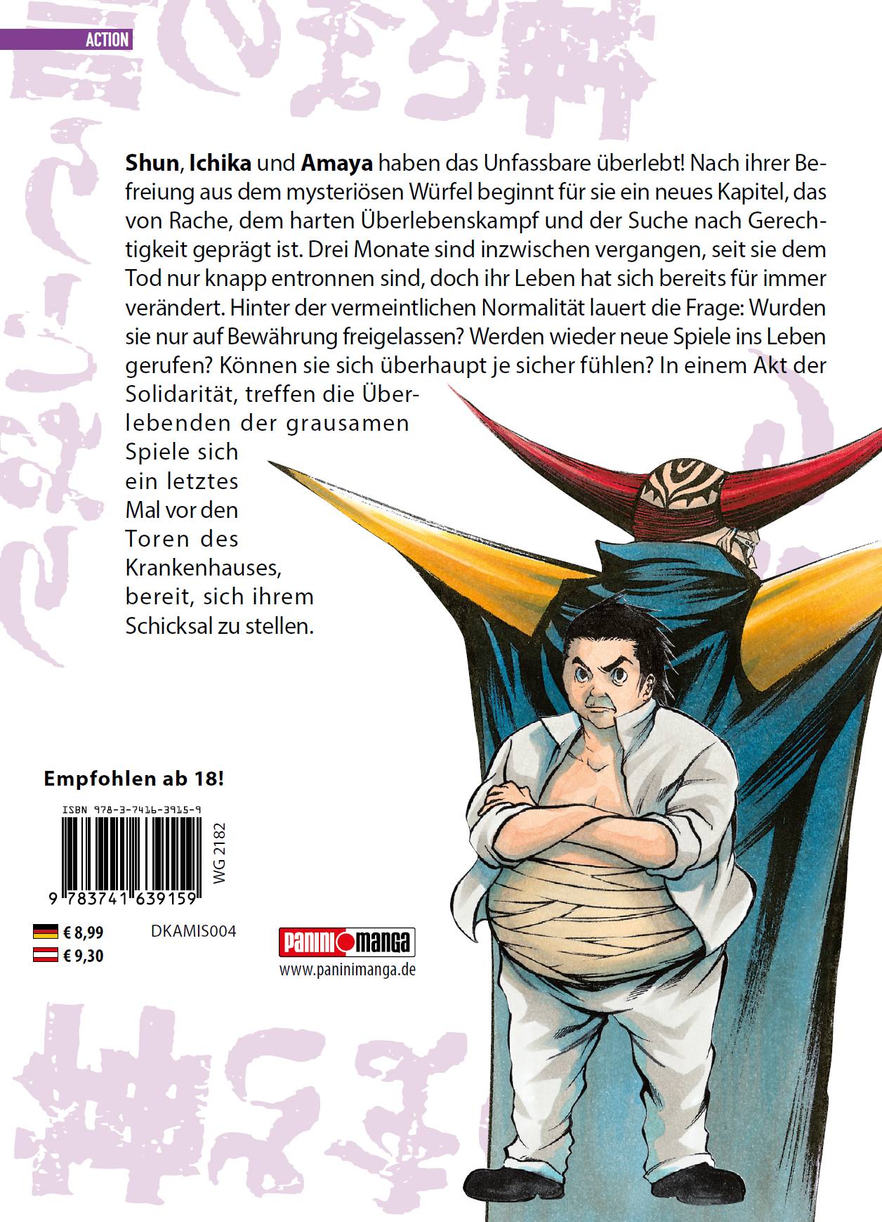 Der übernatürliche Horrorhit und die Vorlage von Takashi Miikes gleichnamiger VerfilmungAS THE GODS WILL entführt dich in eine Welt voller grausamer und tödlicher Herausforderungen, die einer Schulklasse von einem mysteriösen Gott auferlegt werden. Werden sie es schaffen, die Wahrheit hinter diesem Albtraum zu enthüllen und ihr Leben zu retten?Das erwartet dich in Band 4: Shun, Ichika und Amaya haben das Unfassbare überlebt! Nach ihrer Befreiung aus dem mysteriösen Würfel beginnt für sie ein neues Kapitel, das von Rache, dem harten Überlebenskampf und der Suche nach Gerechtigkeit geprägt ist. Drei Monate sind inzwischen vergangen, seit sie dem Tod nur knapp entronnen sind, doch ihr Leben hat sich bereits für immer verändert. Hinter der vermeintlichen Normalität lauert die Frage: Wurden sie nur auf Bewährung freigelassen? Werden wieder neue Spiele ins Leben gerufen? Können sie sich überhaupt je sicher fühlen? In einem Akt der Solidarität, treffen die Überlebenden der grausamen Spiele sich ein letztes Mal vor den Toren des Krankenhauses, bereit, sich ihrem Schicksal zu stellen.Für Fans von Psycho-Thrillern, Survival- und Horror-Manga!