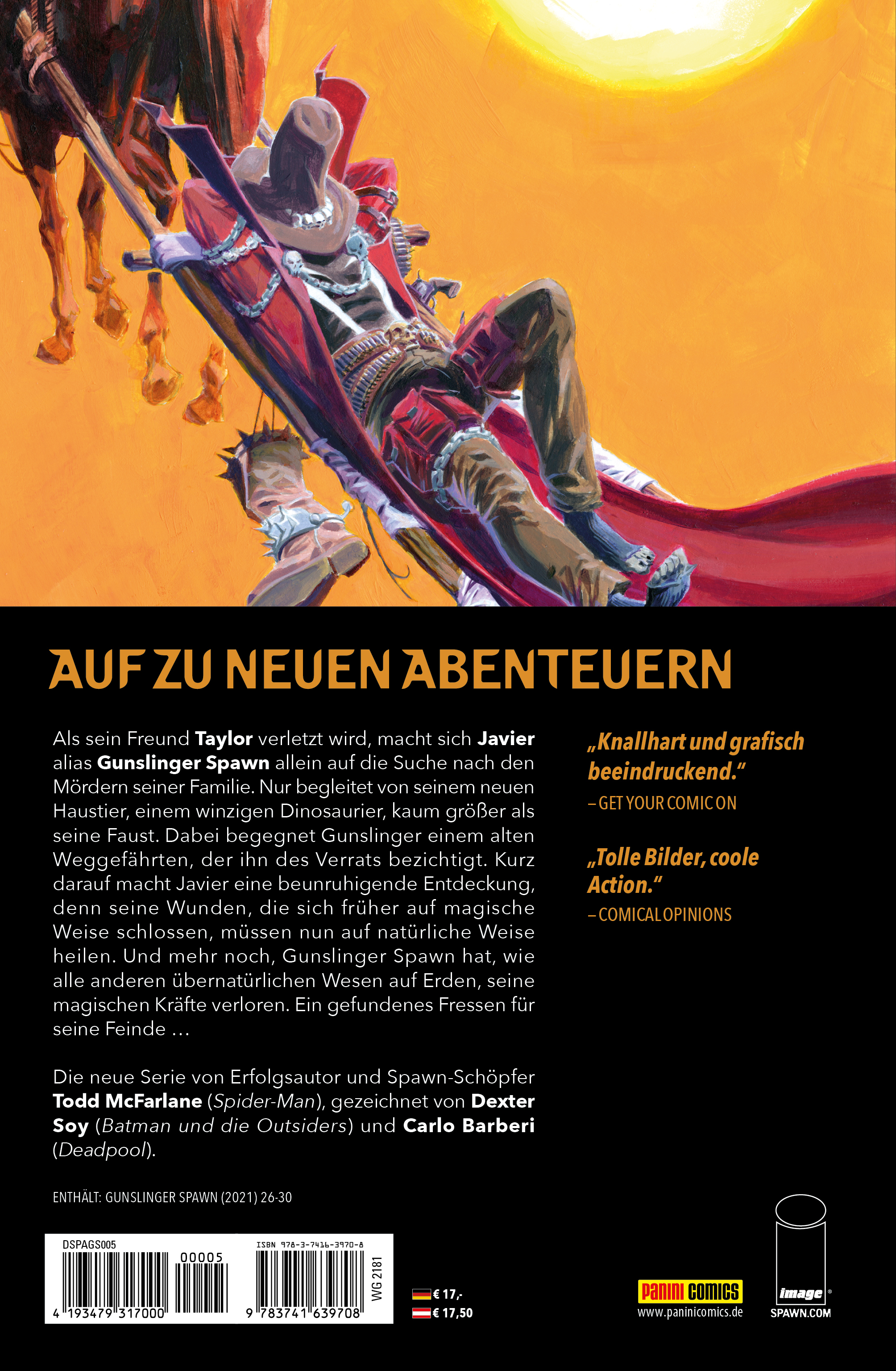 AUF ZU NEUEN ABENTEUERNAls sein Freund Taylor verletzt wird, macht sich Javier alias Gunslinger Spawn allein auf die Suche nach dem Mörder seiner Familie. Nur begleitet von seinem neuen Haustier, einem winzigen Dinosaurier, kaum größer als seine Faust. Dabei begegnet Gunslinger einem alten Weggefährten, der ihn des Verrats bezichtigt. Kurz darauf macht Javier eine beunruhigende Entdeckung, denn seine Wunden, die sich früher auf magische Weise schlossen, müssen nun auf natürliche Weise heilen. Und mehr noch, Gunslinger Spawn hat, wie alle anderen übernatürlichen Wesen auf Erden, seine magischen Kräfte verloren. Ein gefundenes Fressen für seine Feinde ...Die neue Serie von Erfolgsautor und Spawn-Schöpfer Todd McFarlane (Spider-Man), gezeichnet von Dexter Soy (Batman und die Outsiders) und Carlo Barberi (Deadpool).ENTHÄLT: GUNSLINGER SPAWN (2021) 26-30