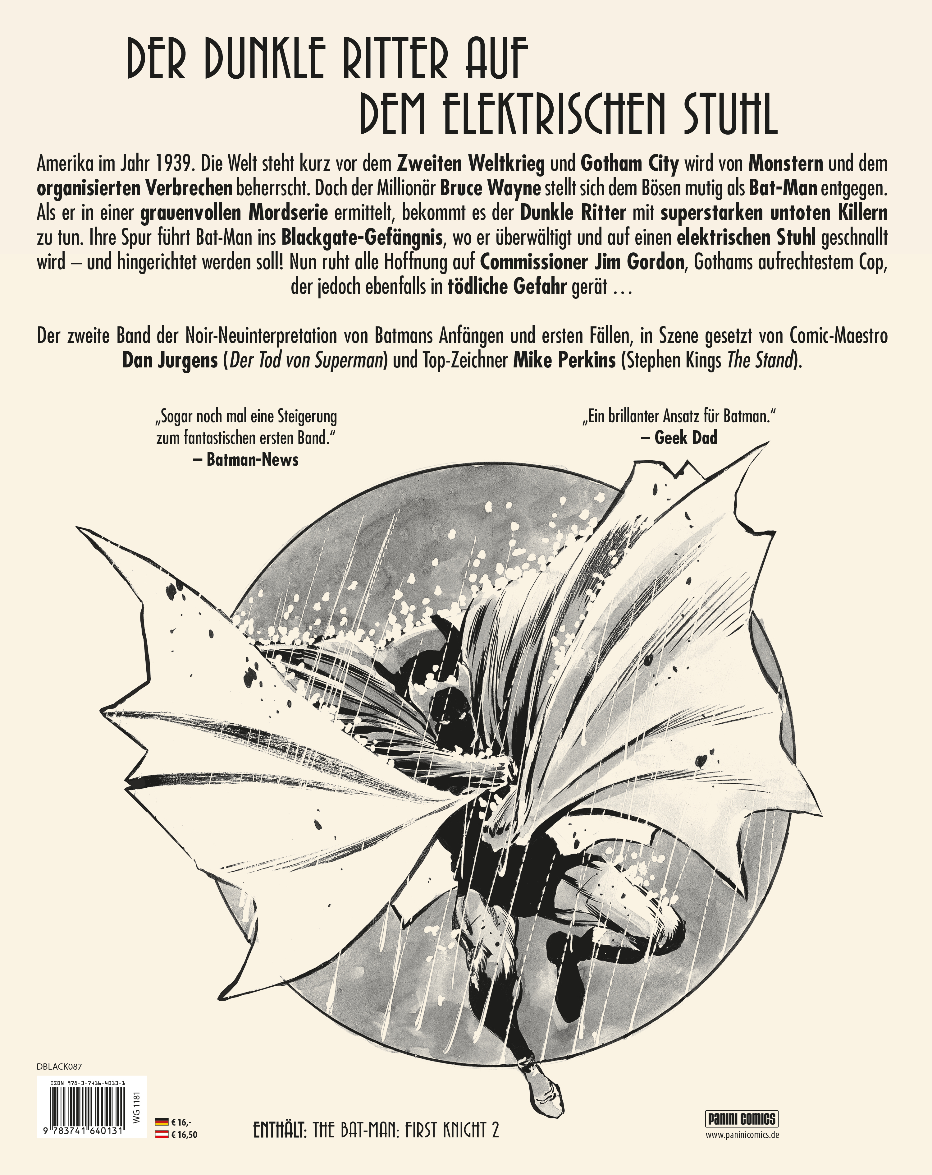 DER DUNKLE RITTER AUF DEM ELEKTRISCHEN STUHLAmerika im Jahr 1939. Die Welt steht kurz vor dem Zweiten Weltkrieg und Gotham City wird von Monstern und dem organisierten Verbrechen beherrscht. Doch der Millionär Bruce Wayne stellt sich dem Bösen mutig als Bat-Man entgegen. Als er in einer grauenvollen Mordserie ermittelt, bekommt es der Dunkle Ritter mit superstarken untoten Killern zu tun. Ihre Spur führt Bat-Man ins Blackgate-Gefängnis, wo er überwältigt und auf einen elektrischen Stuhl geschnallt wird - und hingerichtet werden soll! Nun ruht alle Hoffnung auf Commissioner Jim Gordon, Gothams aufrechtestem Cop, der jedoch ebenfalls in tödliche Gefahr gerät ...Der zweite Band der Noir-Neuinterpretation von Batmans Anfängen und ersten Fällen, in Szene gesetzt von Comic-Maestro Dan Jurgens (Der Tod von Superman) und Top-Zeichner Mike Perkins (Stephen Kings The Stand).ENTHÄLT: THE BAT-MAN: FIRST KNIGHT 2