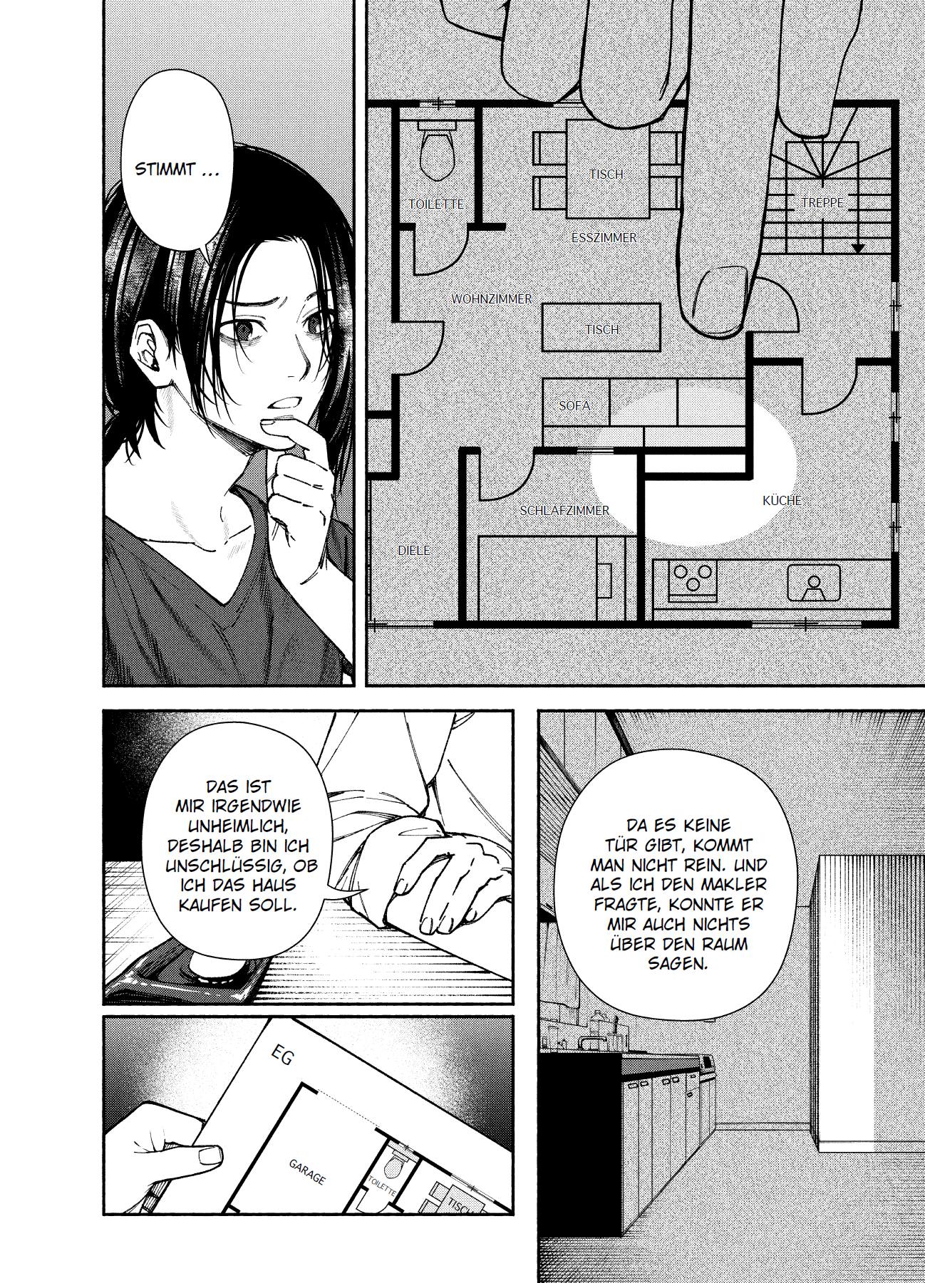 Ein junger, auf Okkultismus spezialisierter Autor wird von seinem Bekannten Yanaoka gebeten, sich den Grundriss eines Hauses und Kaufobjekts anzuschauen, auf dem ein versteckter Raum zu sehen ist. Da es sich nicht um eines der üblichen "Spukhäuser" handelt, mit denen der Autor sonst zu tun hat, zeigt er den Grundriss dem ebenfalls okkultismusbegeisterten Architekten Kurihara. Dieser entdeckt noch weitere Merkwürdigkeiten und äußert die Vermutung, dass das Haus für Missbrauch benutzt wurde. Doch der Autor erkennt noch eine andere Möglichkeit. Und er lässt auch dann nicht locker, als Yanaoka vom Kauf des Hauses Abstand nimmt.